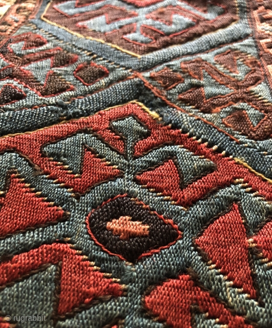 Rare and old, this "weftless sumak" (simple weft-wrapping) bag face is fine and exceptional. The colors and patina are beautiful and the subtle, sculpted-like surface that is inherent to so-called "weftless "structures gives this bag face a distinctive surface and rich appearance. The wool is silky. Sometimes called Heybe, Anatolian bags with this kind of age are rare and "weftless sumak" examples - meaning that there is only one set of wrapping wefts with no ground weft between the rows of wrapping wefts - are even more rare. Although an undeniably primary and early structure, Kurdish weavers in Eastern Anatolia seem to have been the only weavers to preserve this structure into the 19th century.