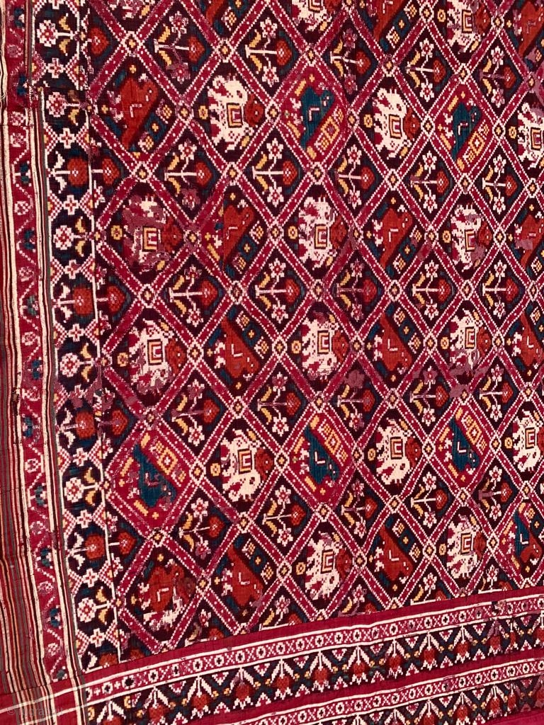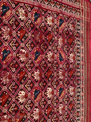 Nari Kunj double ikat Patola silk Dupatta, Probably Patan Gujarat 1800-1850 Circa. India.This Patola is the rarest designs known as Nari Kunj Patola. This Patola is showing the Popat Kunjar Bhat, Hathi Kunjar Bhat, Ful Kunjar Bhat. Popat means parrot, Hathi Means Elephant and Ful means Flower-blossom.This Nari kunj patola dupatta was mainly used by Brahmin and Jain Communities by unmarried girls in Gujarat.the size of this patola is 210 cms x 135 cms the dupatta has some damages but it has been restored by adding lining cloth at the back.