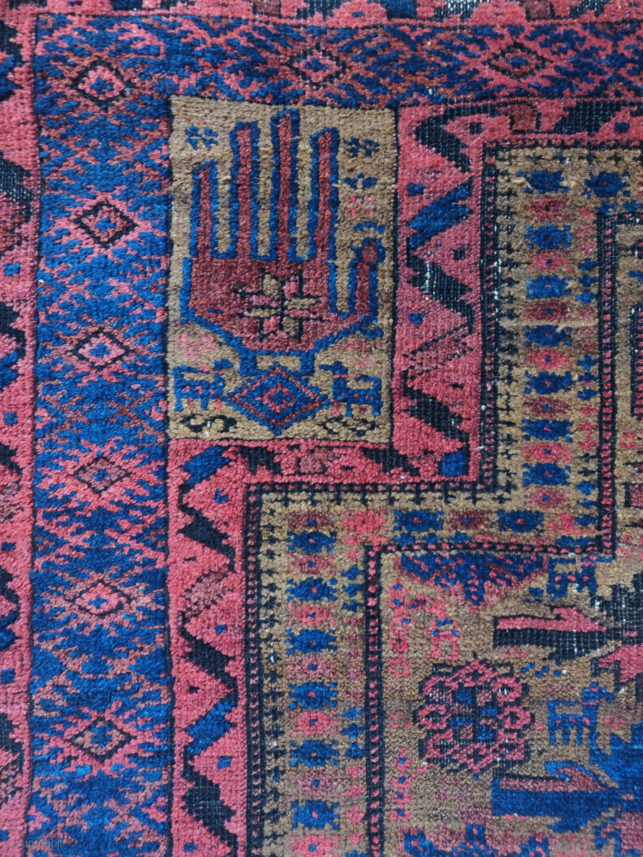 Unusual Baluch prayer rug with dark natural undyed camel wool and saturated natural dyes. An eccentric rendering of a classic design type replete with animals. Larger size than most, 3'3"x5'10"