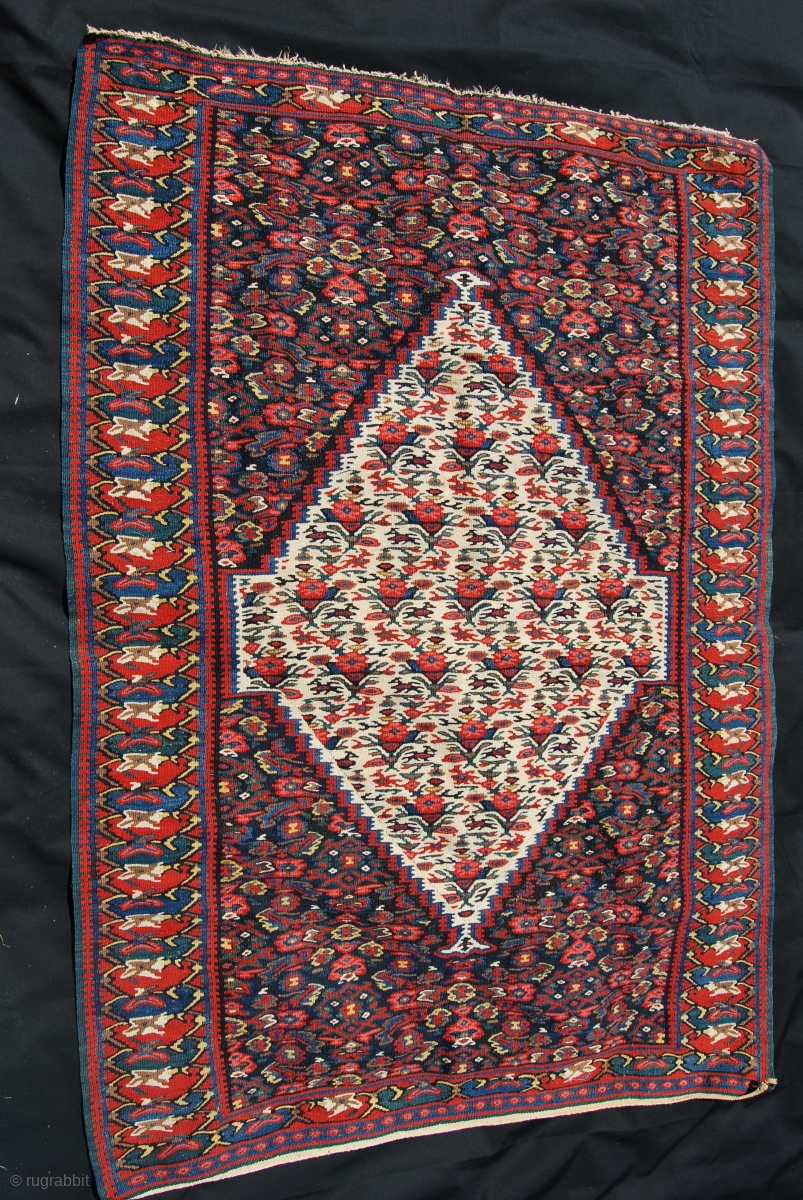 Beautiful Senneh/Sinna kilim. Kurdistan, Western Iran. Cm 105x150. Late 19th/early 20th century. Mint conditions. Great, deep, saturated, natural colors. Lovely pattern with flowers, animals, symbols, etc. See more pics on Facebook: http://www.facebook.com/media/set/?set=a.10151277348899258.521308.358259...