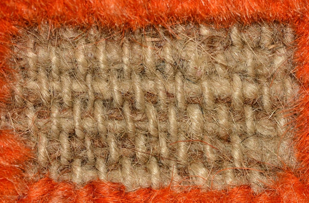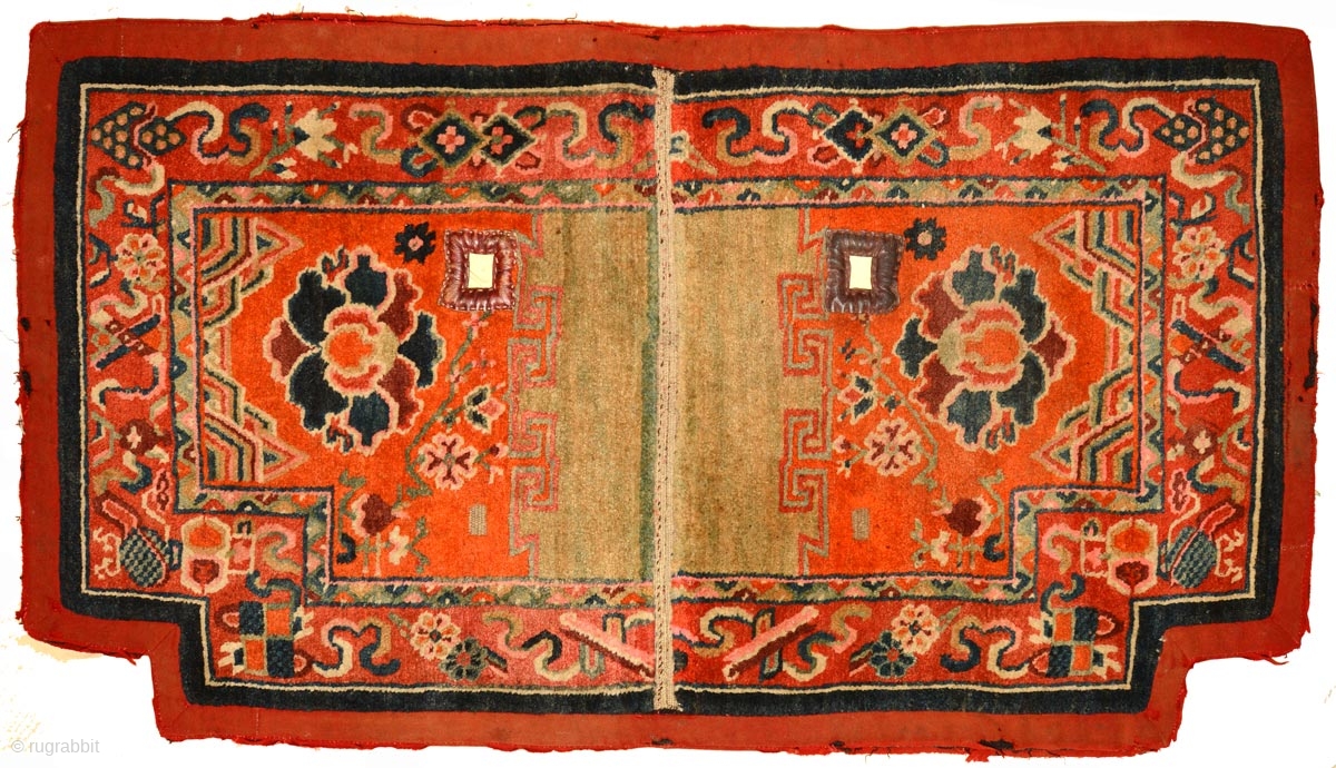 This Tibetan under-saddle carpet or ‘makden’ has a floral design on either side in a reddish-orange main field with abstract clouds and mountains at either end and is enclosed by a narrow, unusual design, inner border. The wide main outer border consist of various motifs both floral and symbolic, while the very outer plain red border is made of red dyed nambu cloth covering a thick felt that was a common post-weave addition to protect the edges of Tibetan saddle carpet from fraying. Only two of the four girth strap holes have been cut open for use and both are edged with leather, while the other two are left pile-less as woven. The wool warp and wool and hair weft are hand spun (as can be seen in the close-up of the uncut girth strap ‘hole’) and the colours are a mix of organic and aniline dyes. The size is 115cm x 62cm (approx. 45.25in x 24.5in) and it is backed by a medium-weight plain cloth. Made circa 1920 it is in excellent condition. For more horse tack please see https://warpandweft.club/portfolio-item/makdens-mashos/