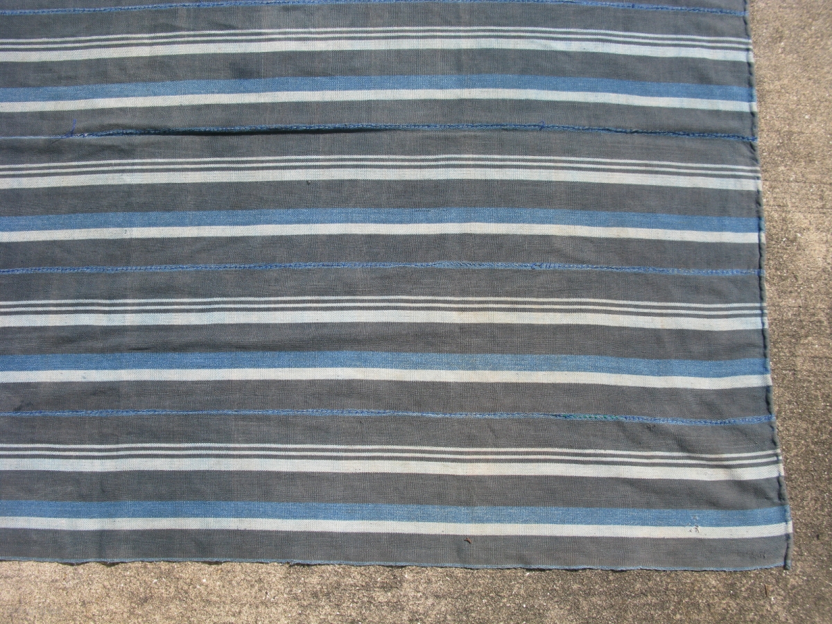 Vintage African indigo cloth, hand woven cotton, Mossi People, Burkina Faso, this is not mud cloth, the cotton fiber is dyed first, and woven by hand into small strips that are then sewn together, this is a textile that was made and used in a remote part of the world, it is not in perfect shape, the ends are not bound, and are a bit frayed into fringe, there may be small holes, and some soiling and fading of color, some separation at the seams, repairs, i have washed it by hand, it is very soft material, and makes a great shawl or wrap around skirt, a nice throw piece on a sofa, or cut up to make pillows or yardage to cover furniture, both sides are shown, the approximate size at the widest points is 36.5in x 55in, #2792, it is amazing how they can control the many shades of indigo blue that you get in this piece, shipping is extra