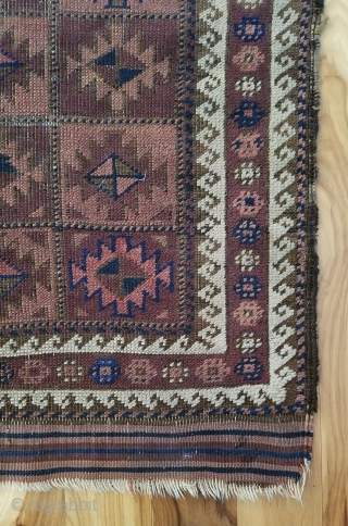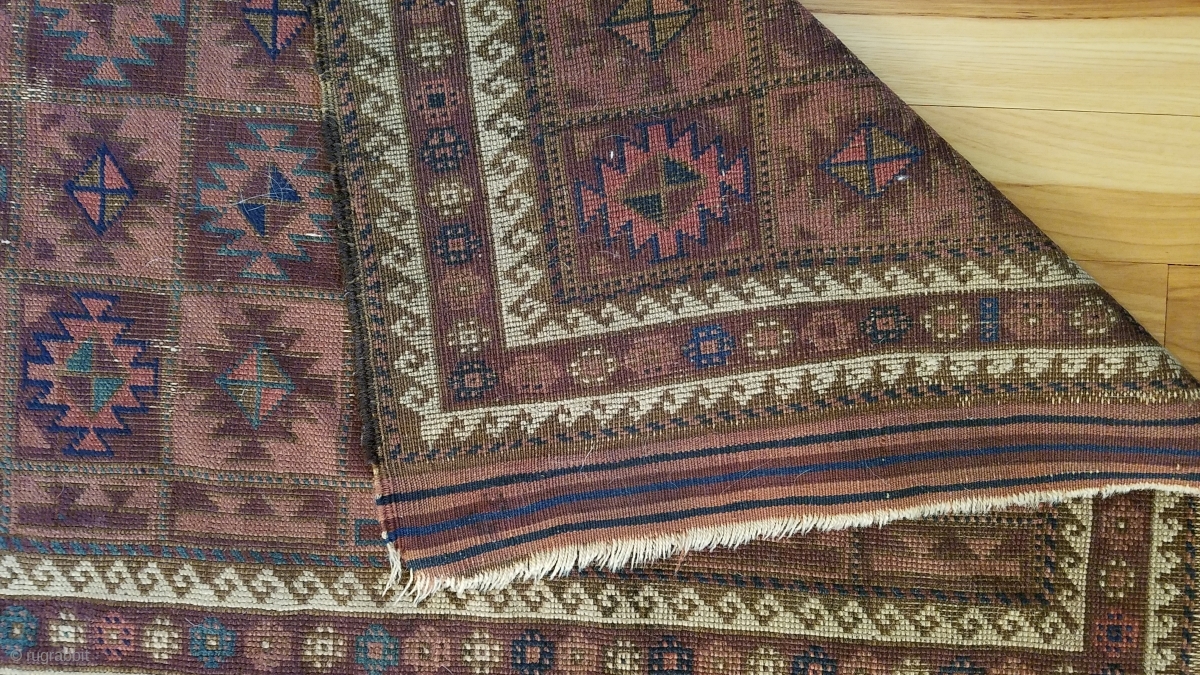Baluch Rug. Unusual and very nicely balanced palette, with multiple shades each of blue, red and purple. 54" x 28". The design and the color would indicate an Aimaq origin. Evenly worn pile; selvages only partially intact. Send email for additional images, questions, etc.