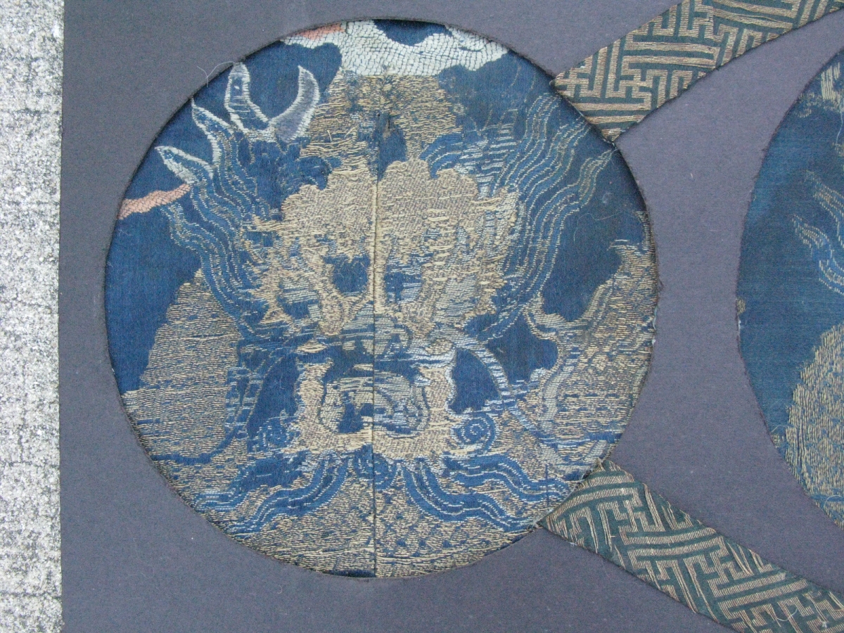 Antique Chinese embroidery dragon robe fragments for nobility, hand woven silk and metal threads, Qing Dynasty, Ch'ing Dynasty, they have 19thC cloud designs above the heads, prior to 1880, a combination of couching and brocade ?, the center fragment is original, the smaller fragment on the left is "cut and shut", which means it is the same piece with some loss to the center, the smaller fragment on the right appears to be married from 2 different dragons, the fragments are cut very close to the edge of the matting, the photos are taken in both indirect and direct sunlight, heavy wear and soiling, they are held in place with glue, the overall presentation is nice, the approximate sizes are: 25.5 x 13.5 inches of the cardboard, the center fragment 8x8 inches, the outside fragments 7x7 inches, #11240, shipping is extra