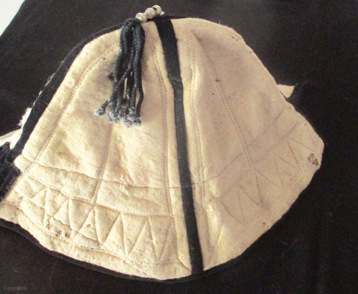 central asian hat from kyrgyzstan (sold) - which are worn by men for ceremonial occasions. The top is made from felt which is a combination of wool and reeds pulped until they become a fabric- like sheet and then left to dry. This material is supple, lightweight and so windproof it is used as the outer skin for the yurts of many Central Asian nomads. The white is significant and is a portrayal of the endless snow which abounds. The top is divided into four quarters which symbolise the four seasons. The inside is lined with heavy duty cotton for the crown and black velvet for the inner rim. a fascinating artifact from a very remote country. There is a similar example in the Volkerkunde Museum in Berlin. Reference 3435. Size is 34 cms., or 14ins. wide by 23 cms., or 10ins. high. Euros 135.