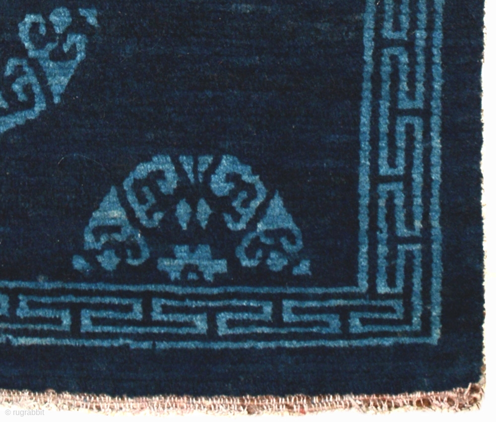 An elegant but subtle two-toned naturally dyed Tibetan seating carpet. a simple turquoise coloured ‘t’ border encases an uncomplicated dark blue central field set with turquoise rosettes, or roundels. It has good pile with a subtle abrash, and a cotton warp and hand-spun wool and hair weft. Of interest is that a red coloured wool has been used in parts - but not throughout - for the double wefting alongside the ‘normal’ singled tone wool, a not often seen deviance to the norm. It was made circa 1920 and the size is 77cm x 57cm (30.25in x 22.5). It is in very good condition.