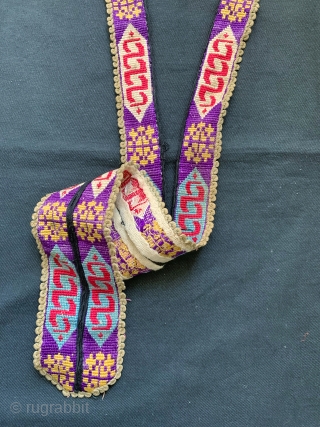 An excellent antique Uzbek Shahrisabz silk embroidered dress collar decoration dating to the 19th century. Shahrisabz region produced some of the most beautiful of all Central Asian embroideries. Their iroqi stitch (not to be confused with iraq) is a form of semi-cross stitched embroidery and they were some of the most sophisticated and intricate textiles, made often into wall hangings, animal coverings and/or robes, belts and garment decorations. This magnificent example would have been attached around the neck and central seems of a dress / chemise. Often these iroqi stitched pieces belonged to garments or decorations of wealthy noble families. The red two-snake woven around each other motif set in elongated hexagons in blue and white against a rich purple ground, is visually dazzling. The work is extremely fine. In mint condition and worthy of any good collection. a beautiful work of textile art offered at a reasonable price. size: 86cm x 9cm. For inquiries please email directly to: istalificollections@outlook.com.