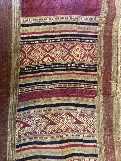Support for a mosquito net to go round the top of the bed. This was an essential element in a woman's trousseau and showed off her skill as a brocade weaver.The motifs were to bring good luck and protection: siho, naga, frog, crab, etc. The net was not only to protect against insects, but also to provide a minimum of privacy in the traditional long house. This one is woven of silk and cotton, dyed with natural dyes, and has borders of a coarser hemp weave to take the weight of the net. See also photo of the reverse side. It was bought in Laos, but a stylistically almost identical one, seen at Thanh Nua in Vietnam, was estimated by its owner to date from the late 1960s-1970, when it was woven by her grandmother. (See also Pamela A.Cross "Lao Tai mosquito nets and curtains" online at tribaltextiles.info.)This band has clearly seen many years of wear, but is intact. Many are now cut up into panels to make then more saleable. It has not been cleaned or mended. The band is 728cm/8 yards long, which is fairly standard. The brocaded band is 18cm/7" wide with 5.5.cm/2" of hemp edging on either side.