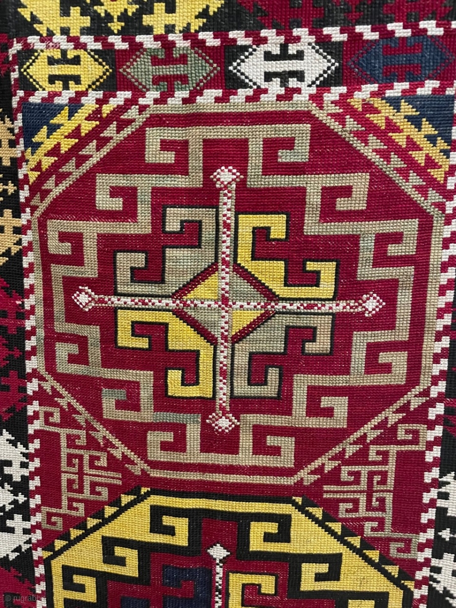 Uzbek napramach embroidered in tightly twisted silk on a plain cotton ground. The medallion design and the colours are very typical. It has been suggested that these motifs, which parallel those found in Greece, originally reached the tribes via the army of Alexander the Great The panel was lined in striped material, now just visible at the borders. The napramach has clearly been used, but is generally in very good condition. Early-mid 20th century.