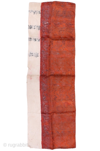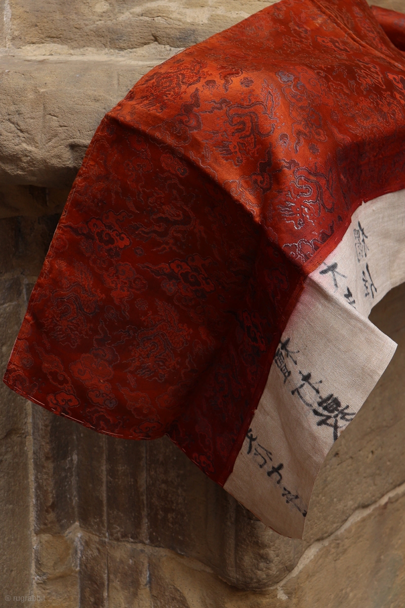 This interesting antique Uchishiki Japanese altar cloth is woven with silk. The delicate motifs represent clouds and dragons and metal thread have been added. It contrasts with the back of thick vegetable fiber, which bears various inscriptions. The textile has flaws, but despite this, all its finesse and elegance can be appreciated.