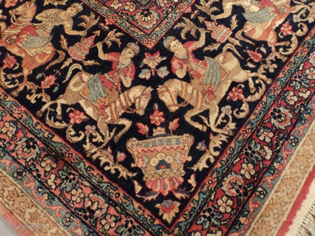 This circa 1925 Persian Laver Kerman antique Oriental rug measures 11’6” x 15’10”. This is a very interesting rug. It has a garden design consisting of six rows of squares. Rows 1, 3 and 5 are filled with a prayer niche motif with cloudbands and floral motifs. Rows 2, 4 and 6 are composed of an arched window motif. Each one of the nine windows is filled with cloudbands and flowers. The entire field is divided into nine sections each containing six separate images such are arched windows and prayer motif. The upper part of the field consists of a triple row of what appear to be tiles in the same motif as that used to separate the three large sections. The images within the nine sections are separated by a column with a Corinthian like capital. The border is very interesting. It is unique in my experience and brings to mind the border of the Pazyrk carpet except here the men on horseback are back to back and pulling something between the two of them which looks like a beehive. The horses are all different. The border has a navy blue ground and there are four pair of reciprocal borders. There is a lot of color in this rug.The rug has complete ends and sides. It is clean and ready to go.