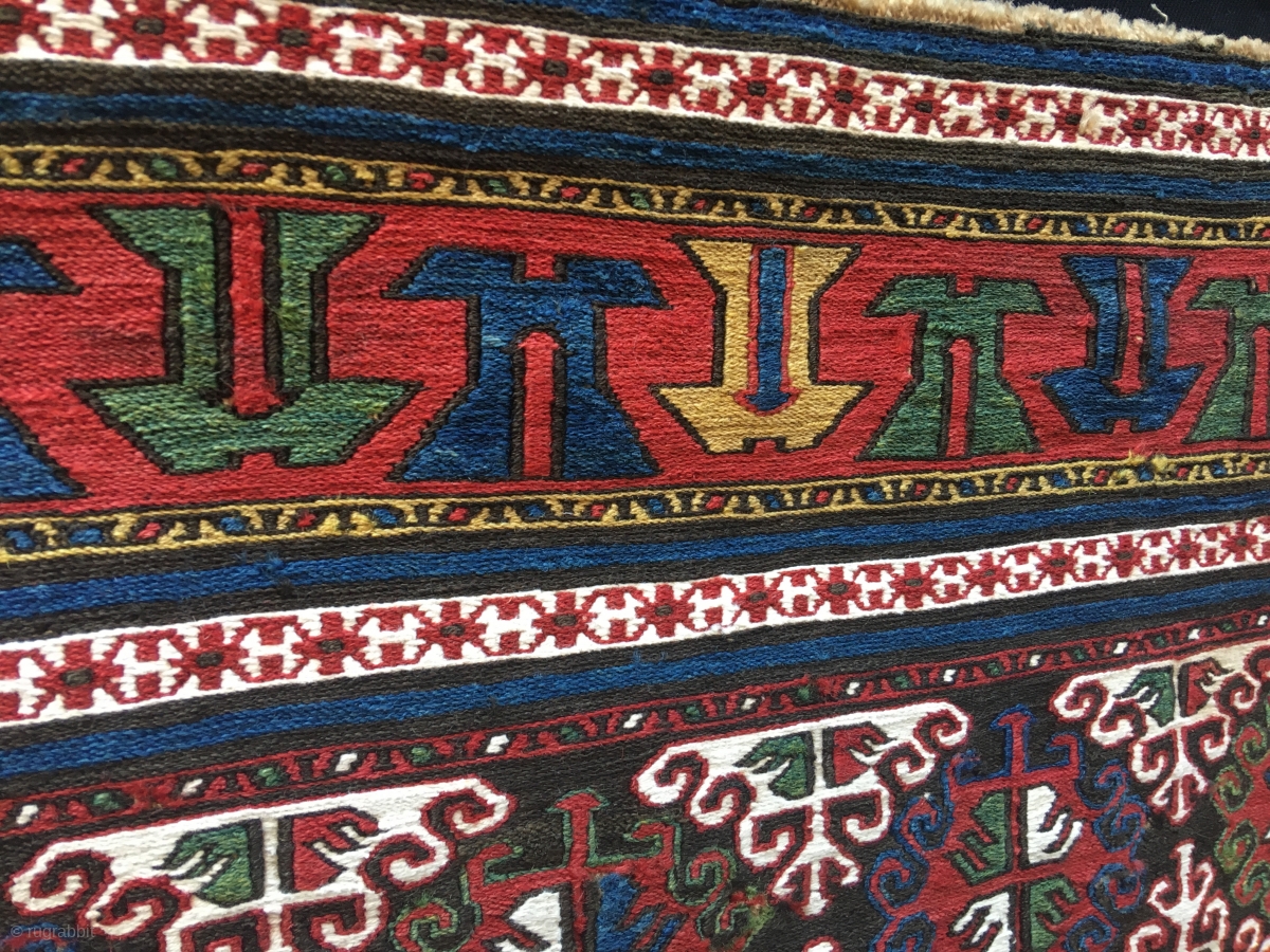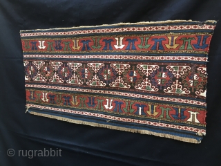 We all know that the Shahsavan tribal group was actually the best as regards weaving, dying, patterns, creativity, etc. Here we have a great Shahsavan Sumack mafrash long panel. Size is cm 50x100 ca. Age is second half of the 19th century. The beauty of the colors is incredible. They are natural, of course, deeply saturated, simply wonderful. The pattern is not very common, it's rather rare and the color balance is again fantastic. Not a panel only, a super panel. Minor condition issues to report.