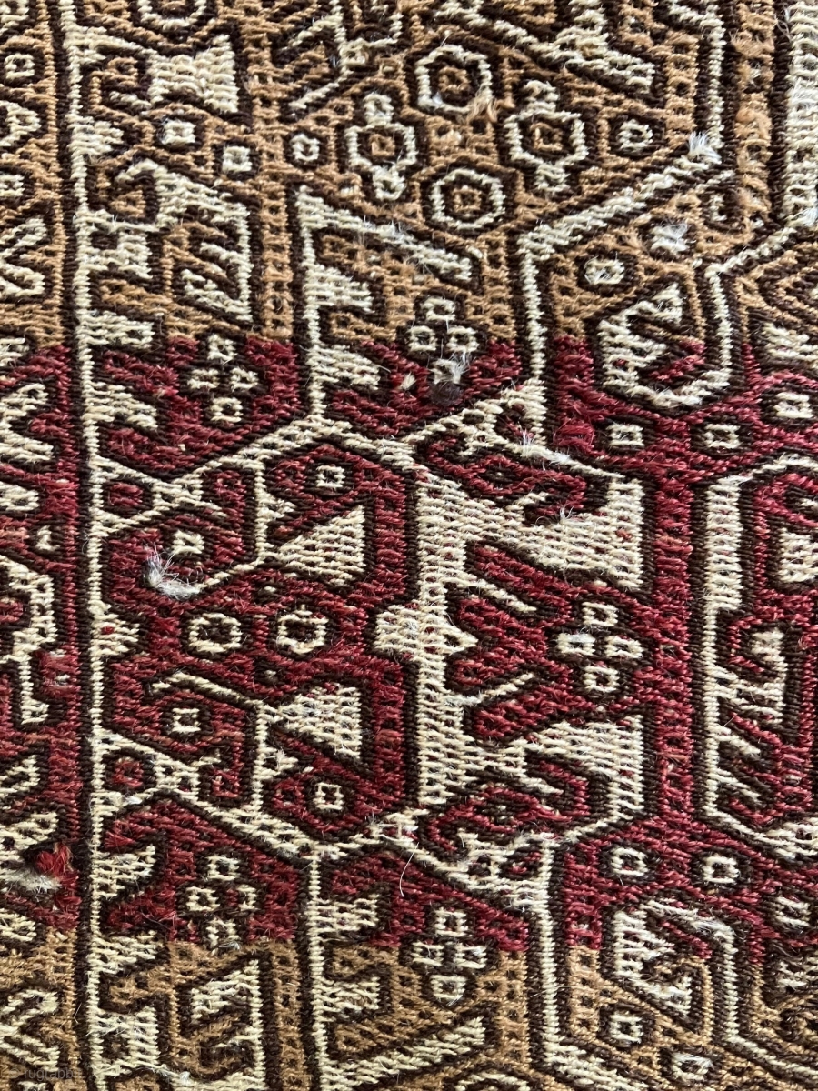 Very interesting Pre-Columbian coca bag with fantastic creatures. This bag has a uniquely complex composition of interlocking imagery on each side. Both positive and negative spaces are readable and can be read from seemingly any direction. This bag is more difficult to decipher than most Andean pieces, but the composition is clearly intentional and there is true genius in it. There are numerous stylized animal heads and body parts. I've been studying Andean textile imagery for many years and this piece presents a real challenge to comprehend. One's eye can play with the imagery endlessly. a.d. 900 - 1200. Size: 9.5 x 7 inches. Complete and in very good condition with original strap.