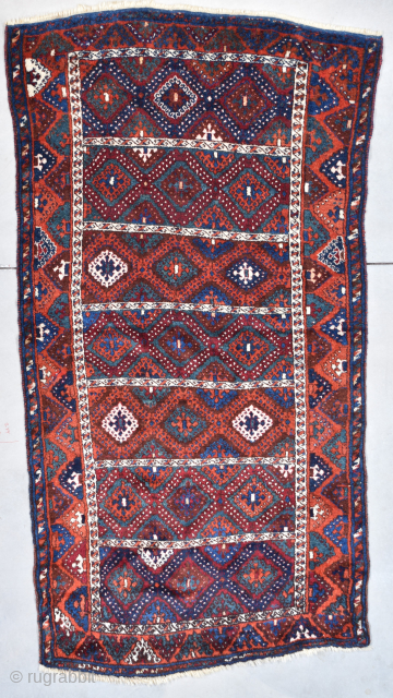 This last quarter 19th century antique Yoruk Oriental Turkish carpet #7748 measures 4’3” x 8’0” (131 x 244 cm). It has a panel motif with seven diamond filled panels that are each different. The rug has very dark Yoruk colors including a clear white and a beautiful fiery red. It is full pile with the fantastic wool only found in Yoruks. The ends and sides are complete. It is clean and ready to go.