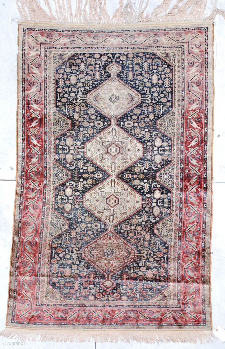 This circa 1900 Keyseri #6448 measures 4’0” x 6’2”. It has a Qashqai design with a dark blue field with four medallions, two red and two ivory. , on an ivory ground with a red border. The ivory areas of the rug which show up as low are souf technique. The rug has a low abrash at the upper end and the rest is full pile. The rug is very very nice. The ends are complete with nice kilims and long fringes.