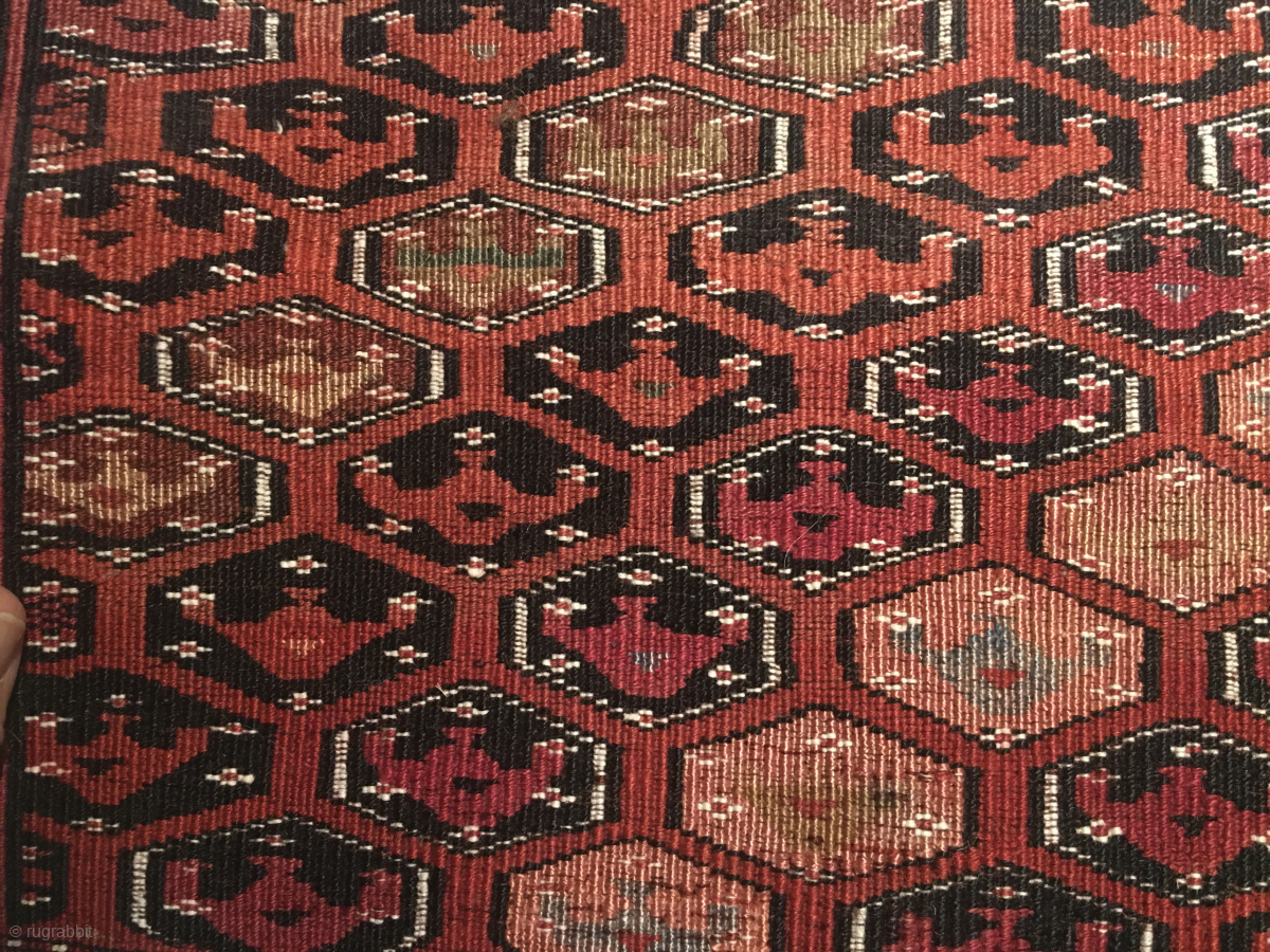 Turkmen Saryk torba. Cm 33x106 ca. Datable 1880/1890. Very nice drawing. Shinly wool, lots of silk all over. Many colors. See back on last pic. Don't ask me more since i don't know much about Turkmen stuff.