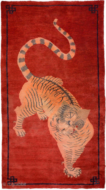 Impressive tiger carpet from the Inner Mongolian region of China. The tiger is very well rendered against a red background and is shown in the classic ‘paw on paw’ stance and a benign friendly face. Made circa 1900 it has cotton warp and weft, size 186cm x 93cm (approximately 73in x 37in). In excellent condition with very delicate colour graduation (not colour-run) throughout the tiger. For more photos and information please see here https://warpandweft.club/portfolio-item/baotou-suiyuan-item-21/
