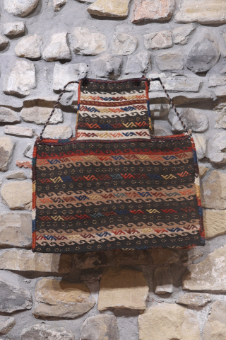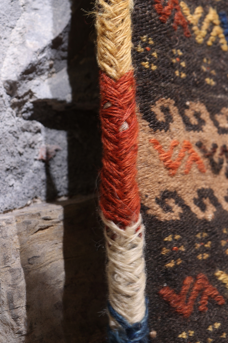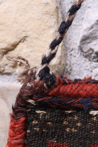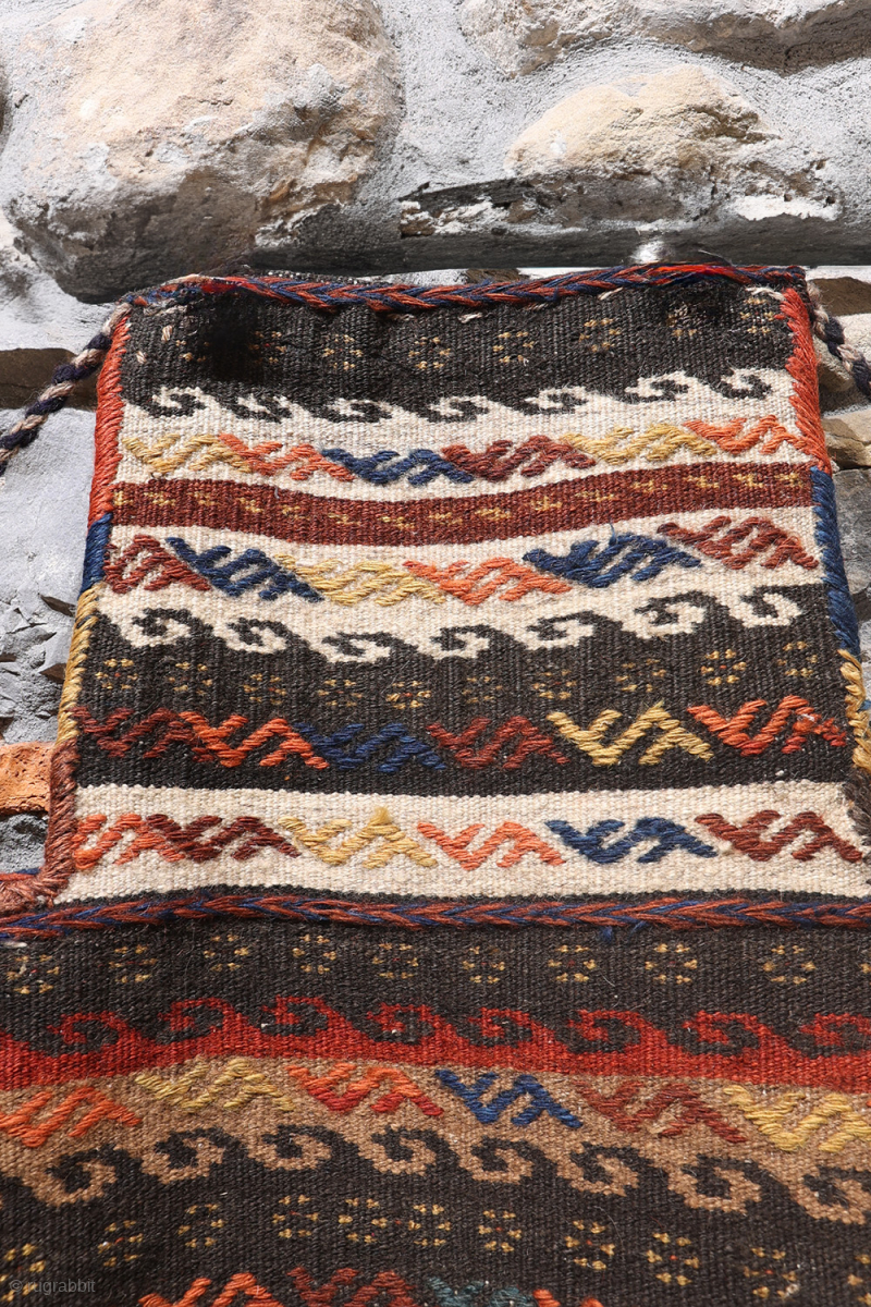 This lovely Qashqai namakdan or salt bag was woven with a combination of natural undyed wool and wool dyed with natural dyes. It is a much bigger namakdan than most. The frontal part is more traditional, but turn it and you will discover an unusual and creative salt bag with a flock of birds! You can buy this namakdan directly from us here: https://www.nomada.biz/en/producto/antique-qashqai-saltbag-or-namakdan-f...