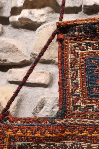 a superb antique Arab namakdan or salt bag woven with the soumak technique from Iran. All the dyes are natural, with a particularly beautiful indigo blue. The lower corners are probably worn, so at one point, the owner of the bag decided to protect them with a leather piece. The back of this beautiful salt back is woven in kilim and left plain, except for the “neck”, which is decorated with a lot of detail in the soumak technique like the front part. a lovely piece for a collection.