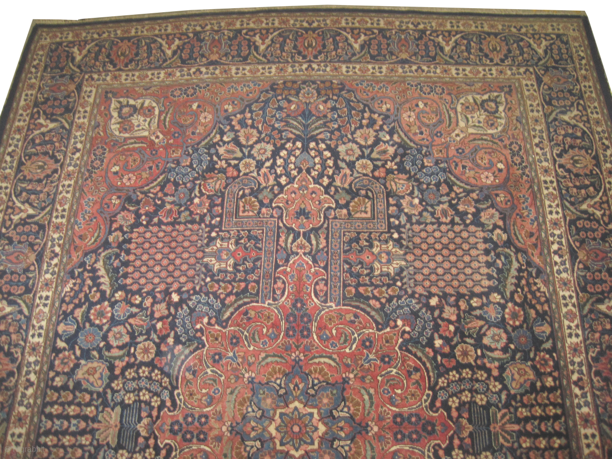 The black knots are oxidized, the knots are hand spun wool, the background color and the surrounded large border are indigo, the center medallion and the four corners are terracotta, minor places the pile is uniformly used, rare example, in its original shape.