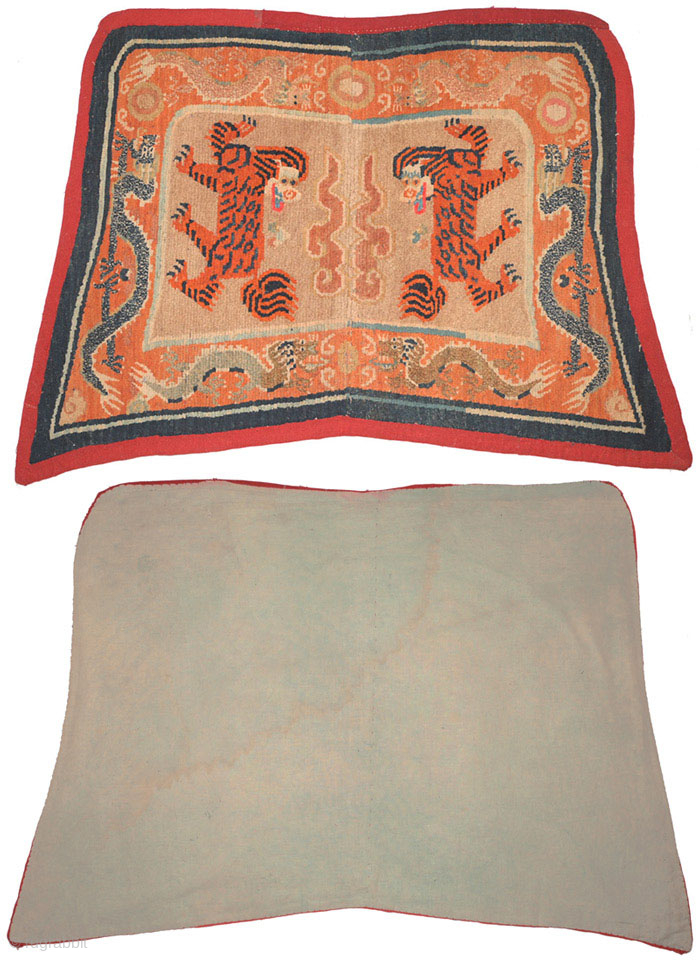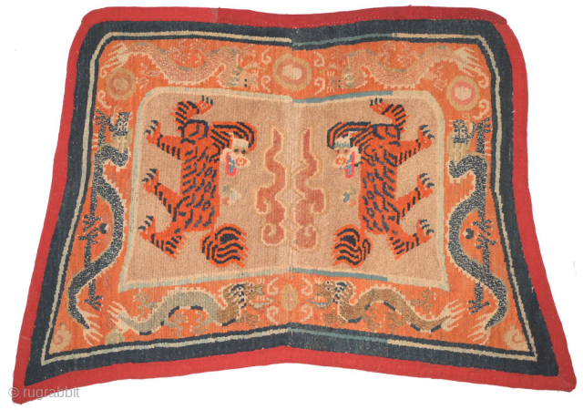 This Tibetan 'butterfly' shaped makden, or under-saddle carpet, features a rare depiction of tigers in place of the snow-lions sometimes seen in the same configuration (on makdens), while sinuous dragons encircle the border. It is from the early part of the 1900’s, has cotton warp and wool weft, is edged in felt covered with red nambu cloth, and is backed by a grey cotton cloth. The size is 111cm wide across the bottom and 67cm high through center (approximately 44in x 26in). It is in excellent condition with good age and an uncommon portrayal of a tiger for this type of carpet. For more photos and information please see https://warpandweft.club/portfolio-item/makden-item-23/
