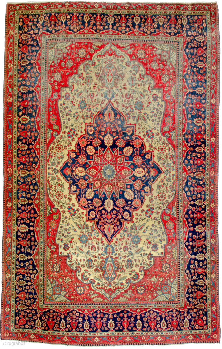Antique Kashan Mohtasham 19th Century 205x147cm. About a third of the piece is evenly worn, and one end is slightly reduced. This has not retracted from the beauty of the piece and means that you can enjoy owning have a remarkable antique piece at a very reasonable price. reduced to CLEAR