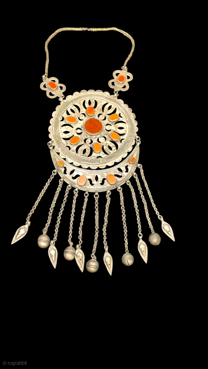 Antique Turkmen necklace, decorated carnelian stones. 278 Grams. Pendant size 14cm x 17cm without tassels.tassels are 10cm.