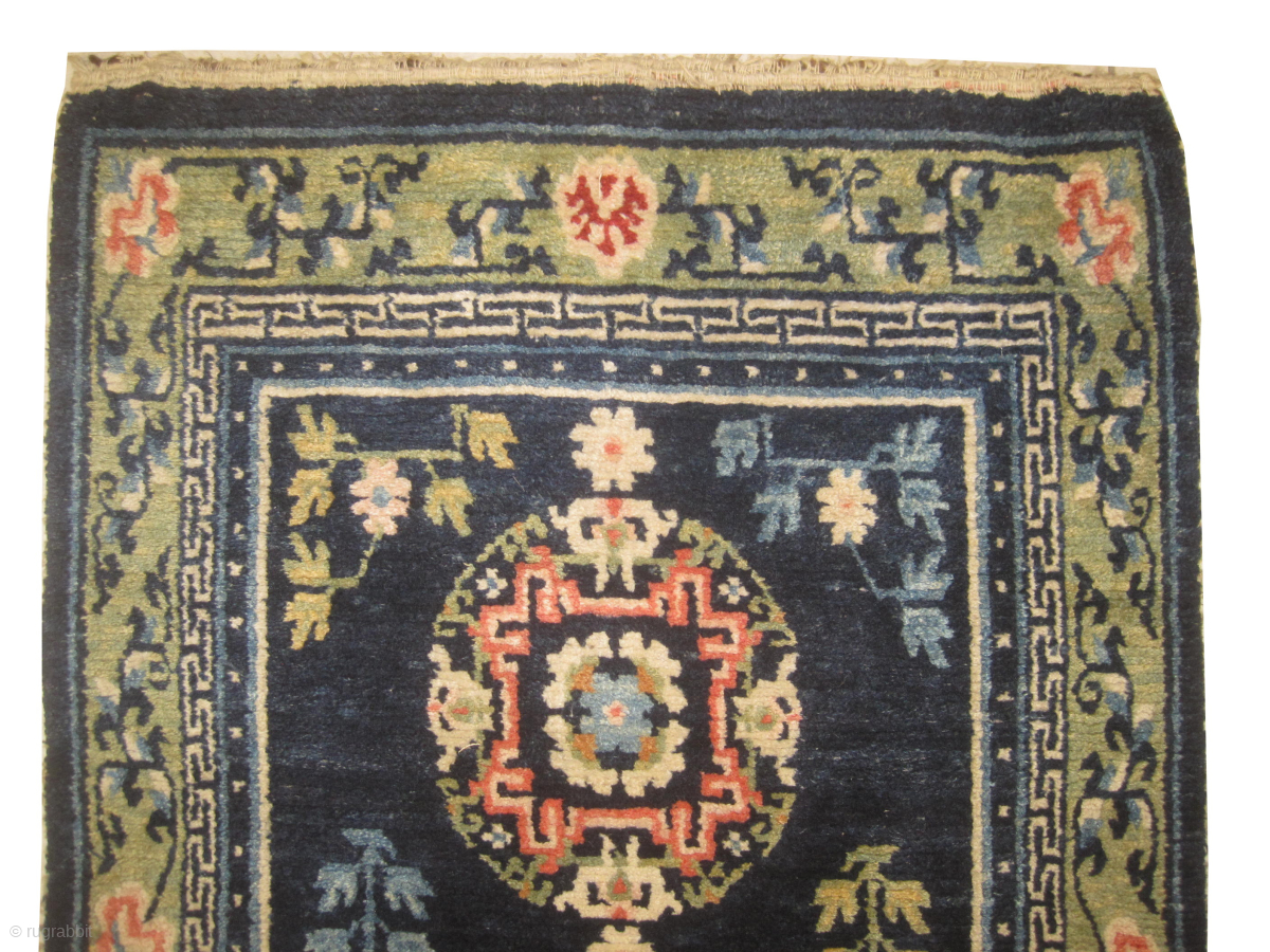 Vegetable dyes, the knots are hand spun lamb wool,the background color is indigo, at the center with three medallions, the surrounded large border is pail green, high pile in perfect condition, in its original shape.