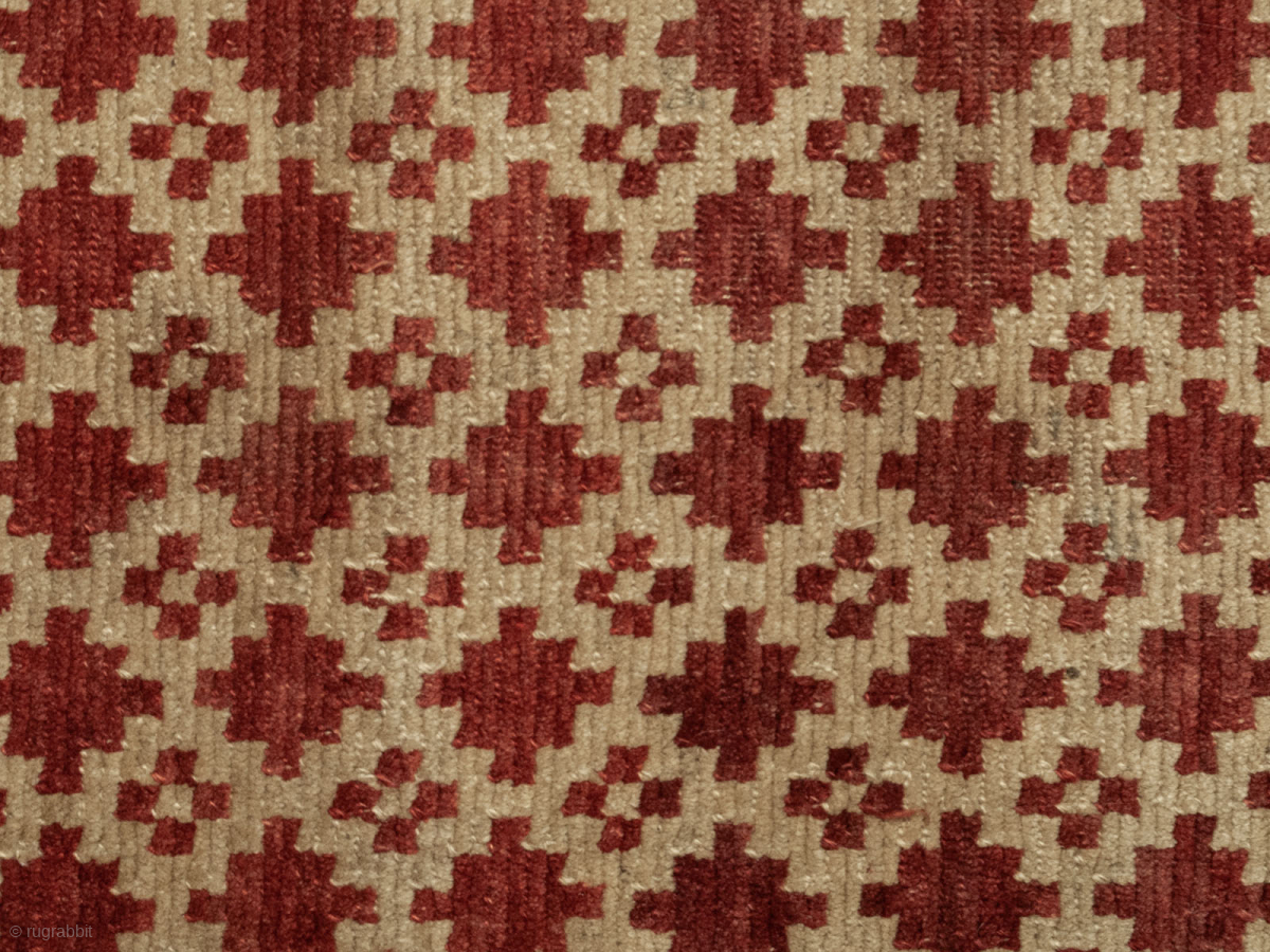 Carpet, Tibet. Wool. 66 inches (167.6 cm) long by 33 inches (84 cm) wide. Early 20th century. a lovely wool carpet from Tibet with a talismanic stepped-polygon and cross motif in a rich brick red on a cream ground. zena@zkta.com