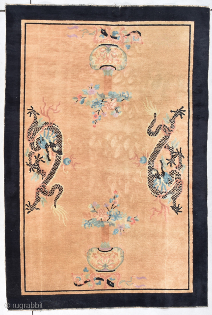 This late 19th century Peking Chinese Oriental Rug #8048 measures 5’3” x 7’11”. It has a sand colored background containing 2 facing dragons. Their scales are done in black. They have white horns and turquoise colored manes. They are five clawed dragons with pink tongues. At each end is a beautifully drawn vase containing large floral motifs sitting on peach colored tables. All is encompassed with a coal black border. The lower left corner has minor pile wear. The ends and sides are complete. It is clean and ready to go.