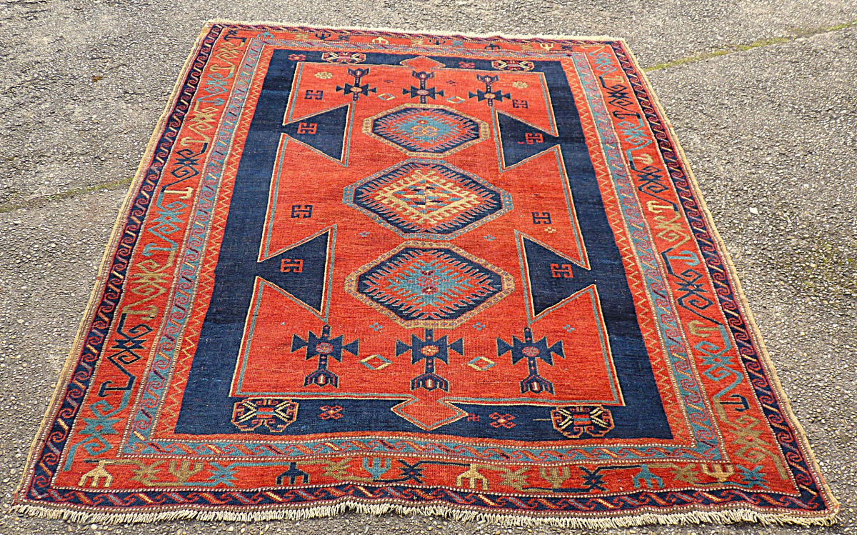 Caucasian rug. Size: 196 x 230 cm. Thin and used pile.