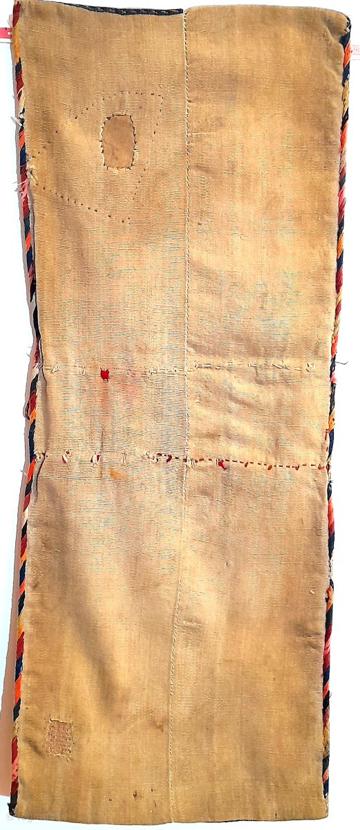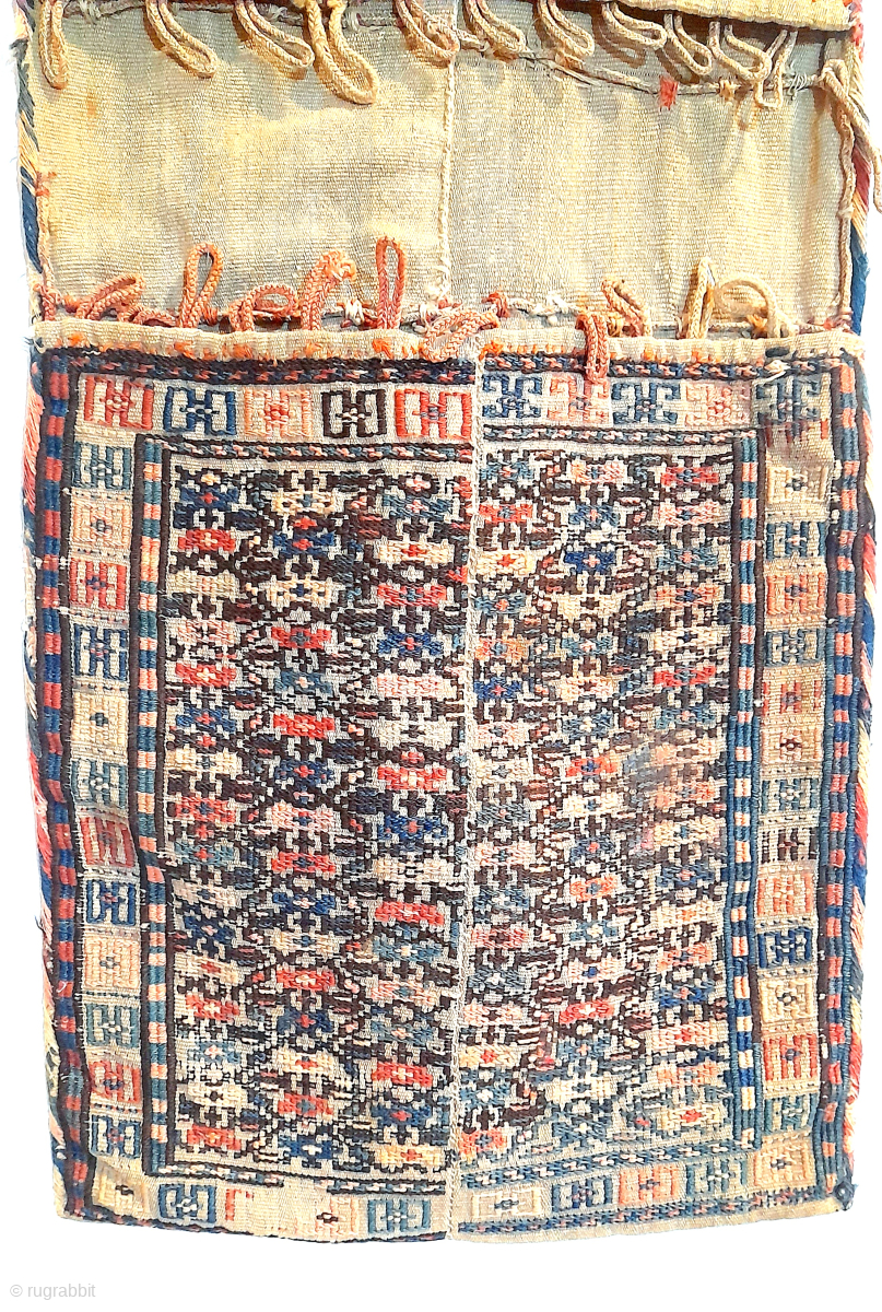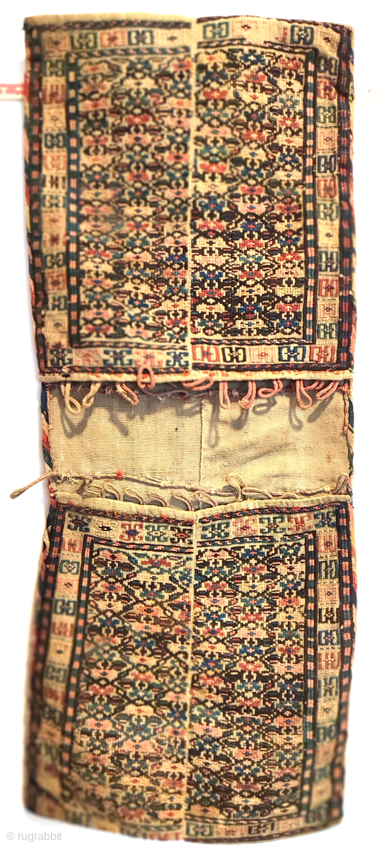 rare antique double bag from the shah savan in north western persia. This tribal group presents great difficulty in determining the origin of their weaving. This is because they were re-settled into Persia from their Anatolian home and during this trek many decided drop out and create their own new areas. Over the centuries they have been influenced by their Persian nomadic neighbours and each has borrowed designs from the other. The foundations of the bag are strips of hessian coloured plain strips of left over kilim. This material can be seen in a few published pieces attributed to the Shah Savan of Moghan. Designs have been added in very fine woven wools with fixtures, such as closing loops, hand spun woven ropes also using left over wool from the backing. Reference 4000. Size 118 x 47 cms, or 46 x 18 inches