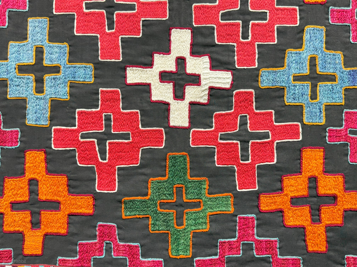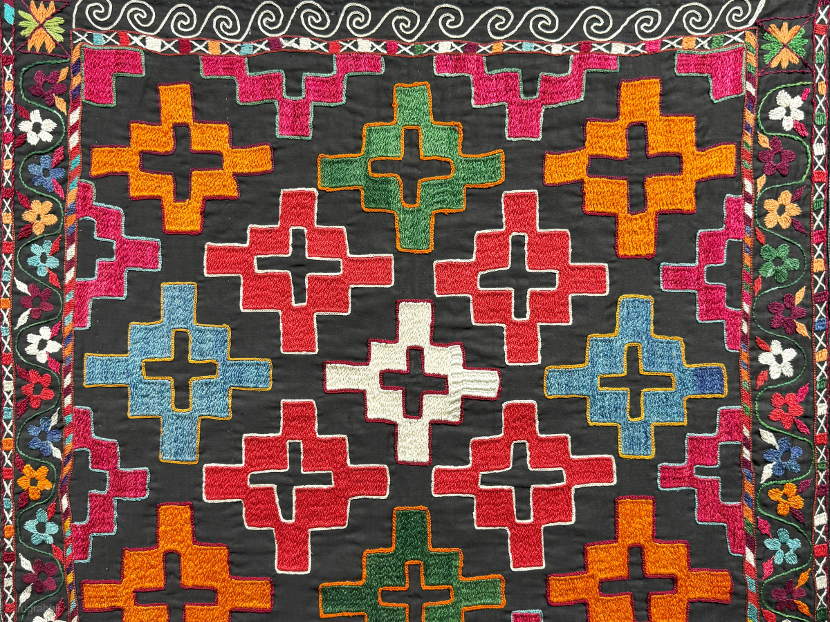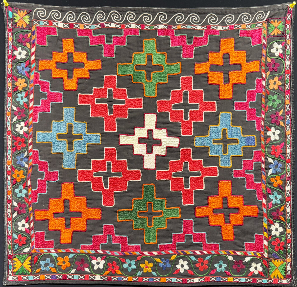 Tajikistan Lakai Silk Embroidered Aina Khalta & Mirror Cover. İt is fine chain stithed embroidery on cotton. Natural colors and great condition. Lined with printed Russian cotton. Size - ''65 cm x 63 cm'' turkmansilver@gmail.com.