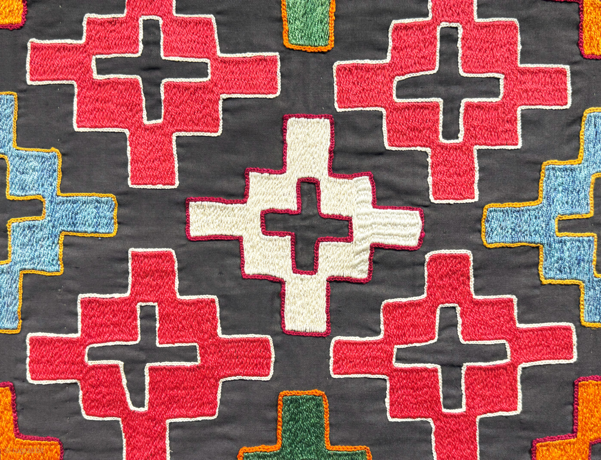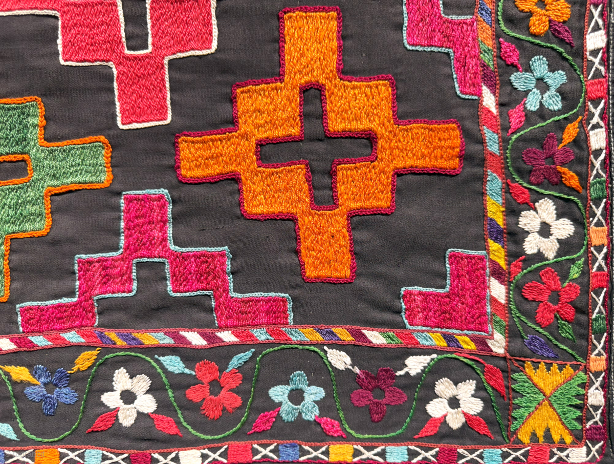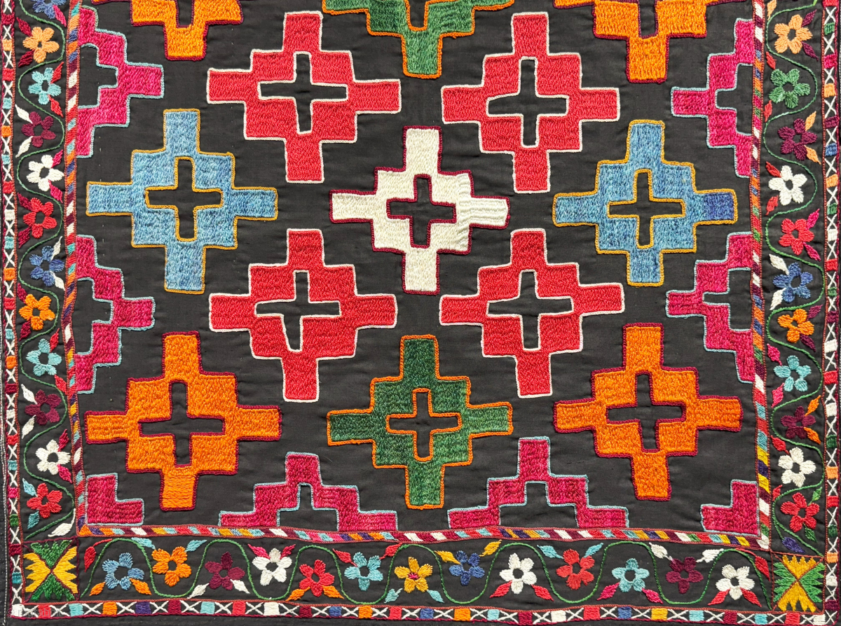 Tajikistan Lakai Silk Embroidered Aina Khalta & Mirror Cover. İt is fine chain stithed embroidery on cotton. Natural colors and great condition. Lined with printed Russian cotton. Size - ''65 cm x 63 cm'' turkmansilver@gmail.com.