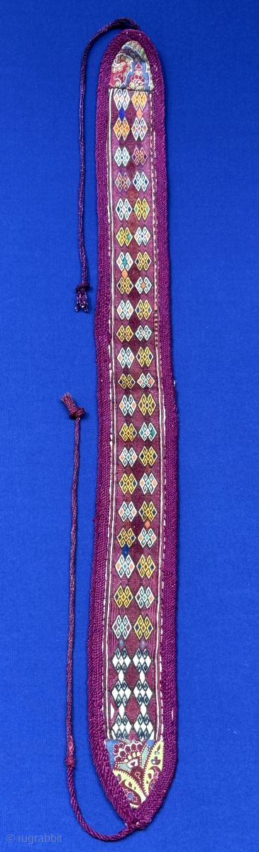 Antique Uzbekistan fine silk embroidered headband. Fine silk embroidery with saturated natural colors from vegetable dyes. Fairly in good condition. Size - 23.5'' x 2'' - ''60 cm x 5 cm'' turkmansilver@gmail.com.