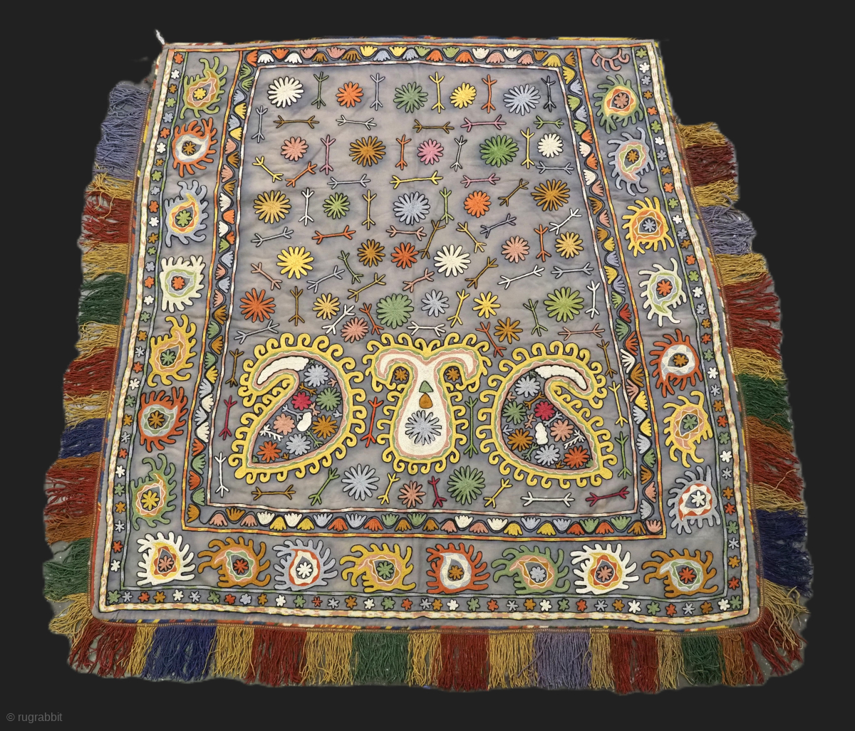 This beautiful embroidered horse / saddle cover was made by the Lakai tribe of Uzbekistan, it was used on special occasions such as weddings. The soft powder blue field is covered in silk embroidery with classic Lakai designs.