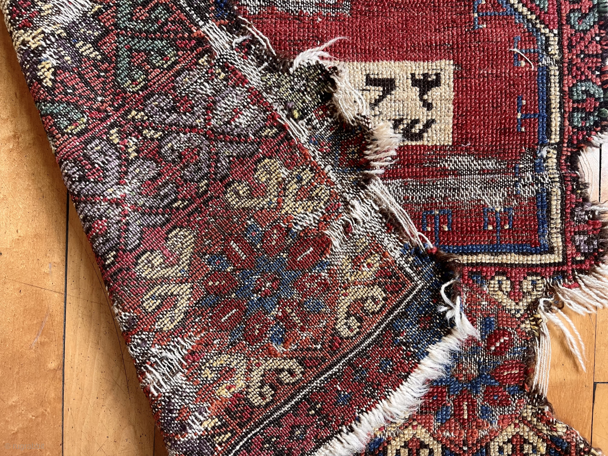 Early Anatolian prayer rug fragment with an unusual inscribed panel. Dated? Great color. Condition as shown. Needs mounting. Great project.