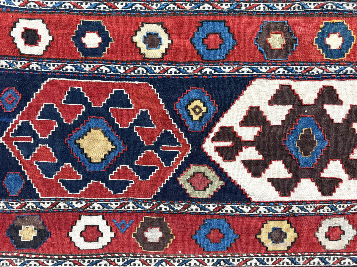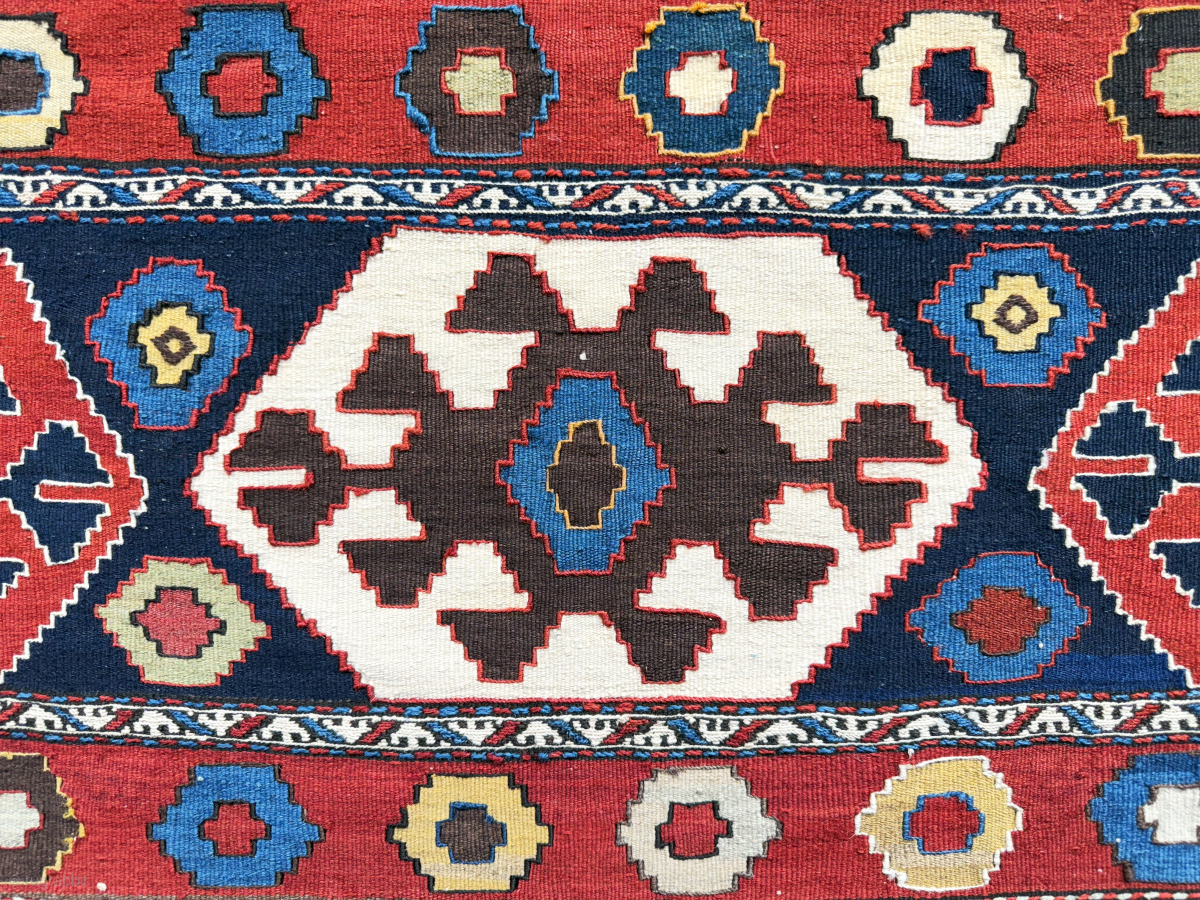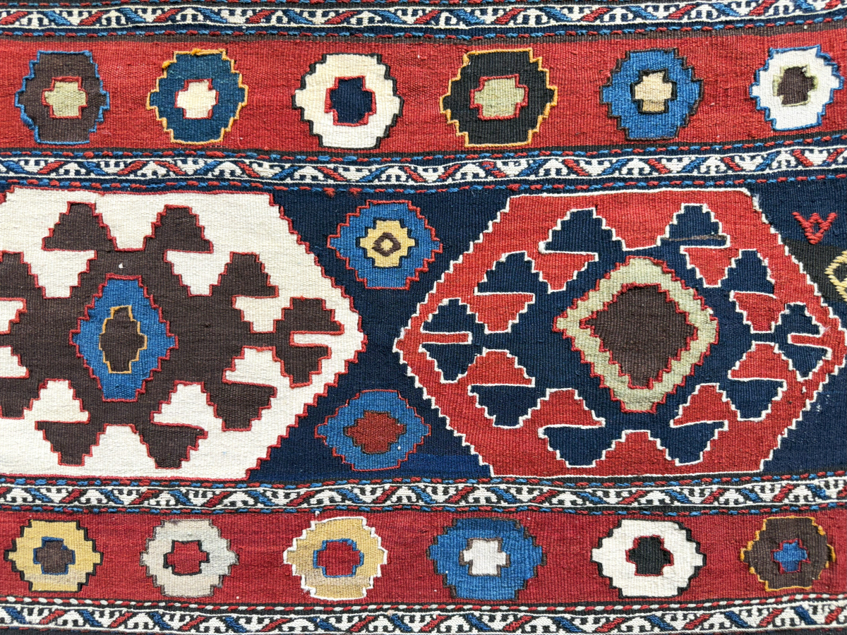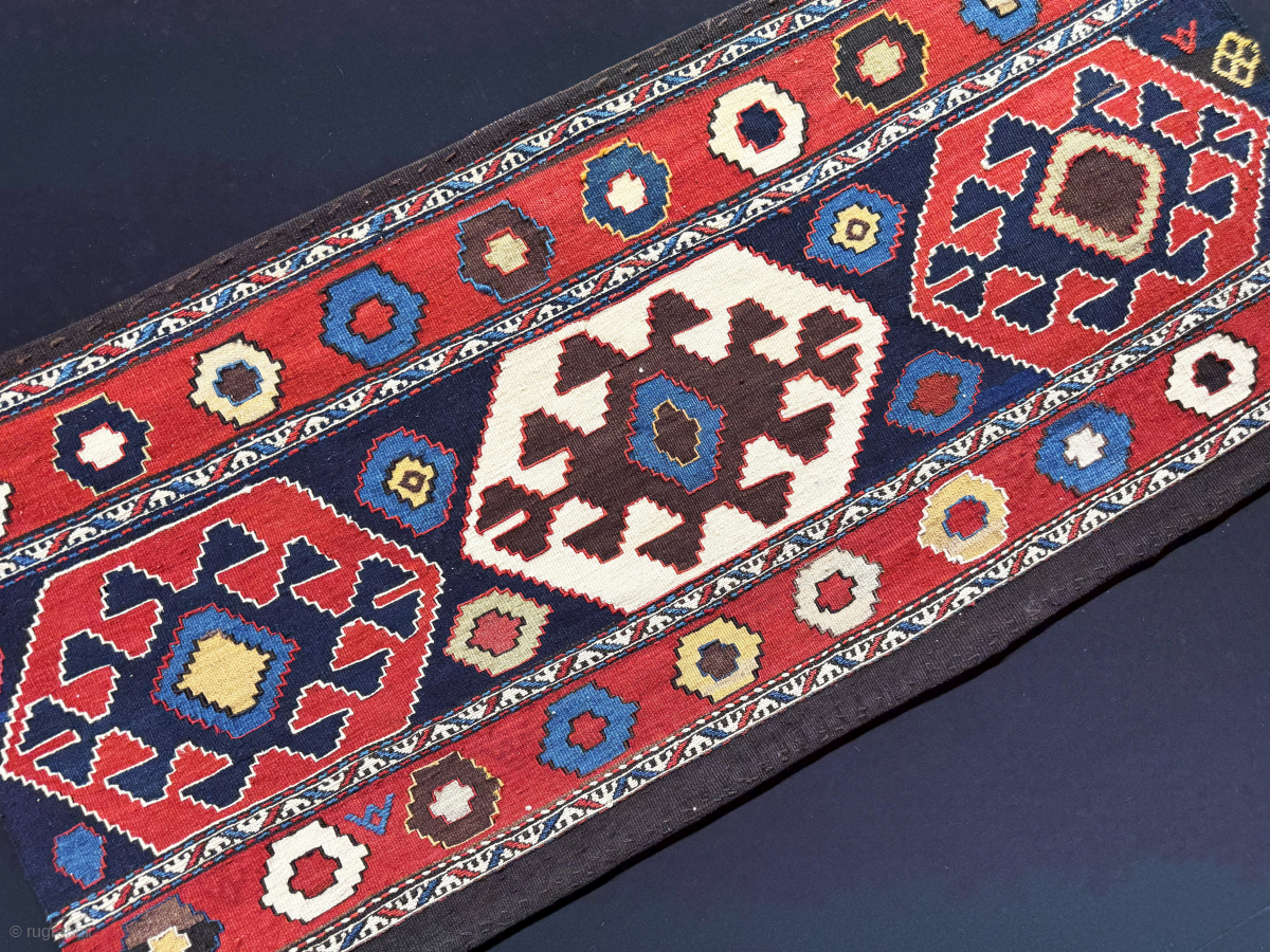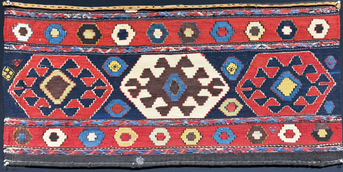 Antique Caucasus Azerbaijan Tribal bedding bag kilim side panel. Very saturated natural colors. Size - 41.5'' x 21'' - ''105 cm x 53 cm'' turkmansilver@gmail.com.