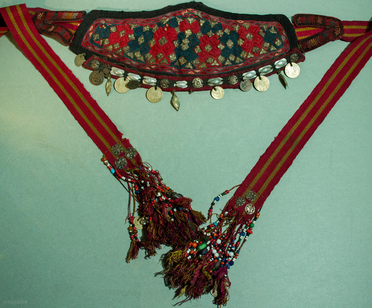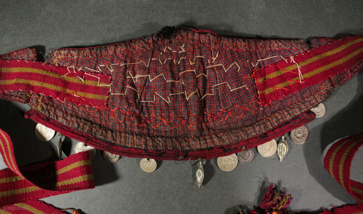 Early rare style Ersari Turkmen headdress with very old upper silver bosses 19th c with additional early 20th c silver and coins , long tie Tassel ends have trade beads , coral beads and silver . Rare museum quality headdress.