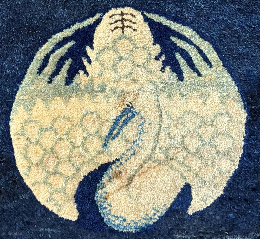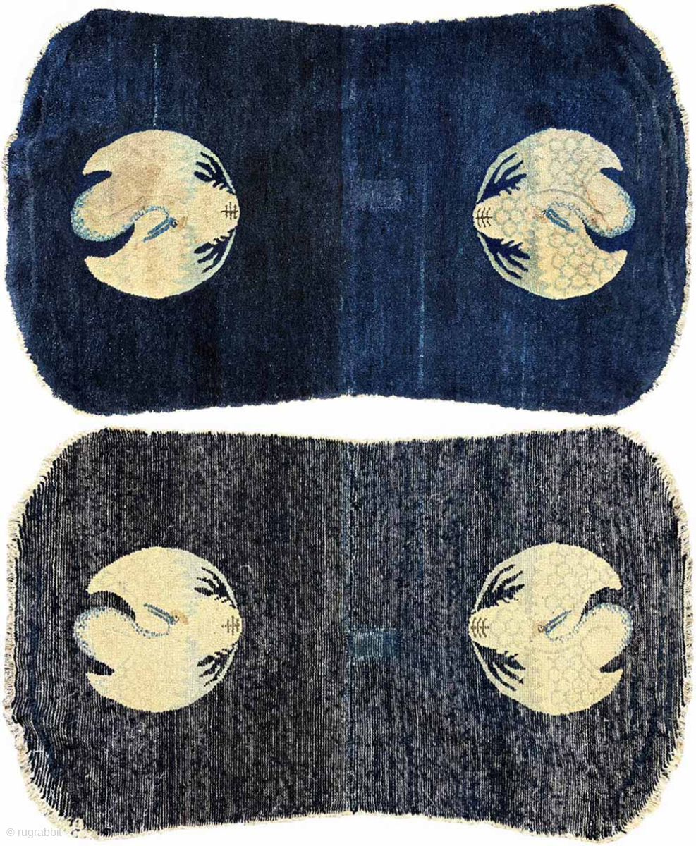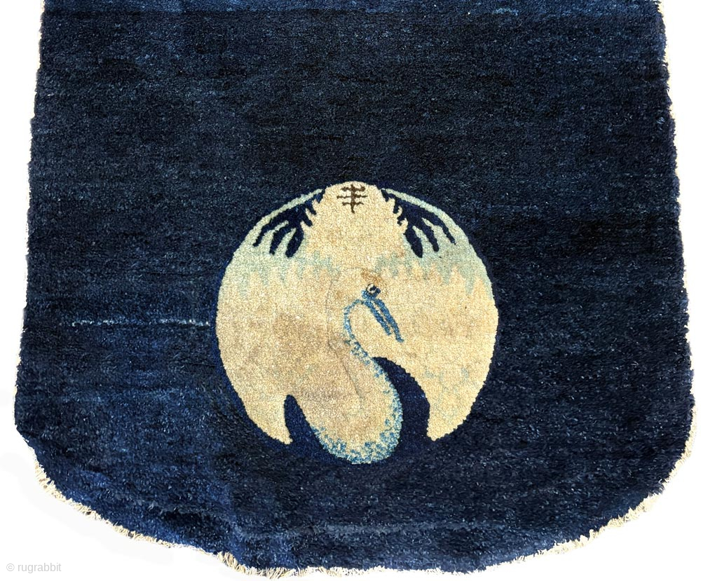 Somewhat unusual shaped saddle carpet made in the Baotou / Inner Mongolia region of China toward the end of the Qing Dynasty. It has a simple but elegant design featuring a single yellow crane either side on a background of a beautifully abrashed deep blue. The crane was a much revered bird in China and the yellow crane is associated with nobility and prestige and represents high status or rank. During the (Ming and) Qing dynasties, the wearing of a robe with a ‘Mandarin Square’ depicting a crane signified the highest rank attainable by civil officials. The size is 103cm x 58cm (40.5in x 23cm), it was made circa 1900 and has cotton warp and weft. There is a repair adjacent to the center line and both ends have had some restoration. Otherwise it is in good condition. For more photos and information please see https://warpandweft.club/portfolio-item/baotou-suiyuan-item-26/