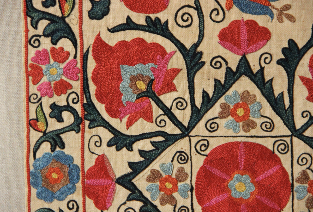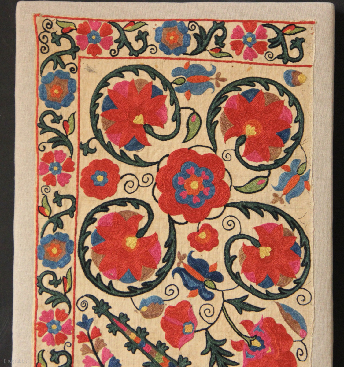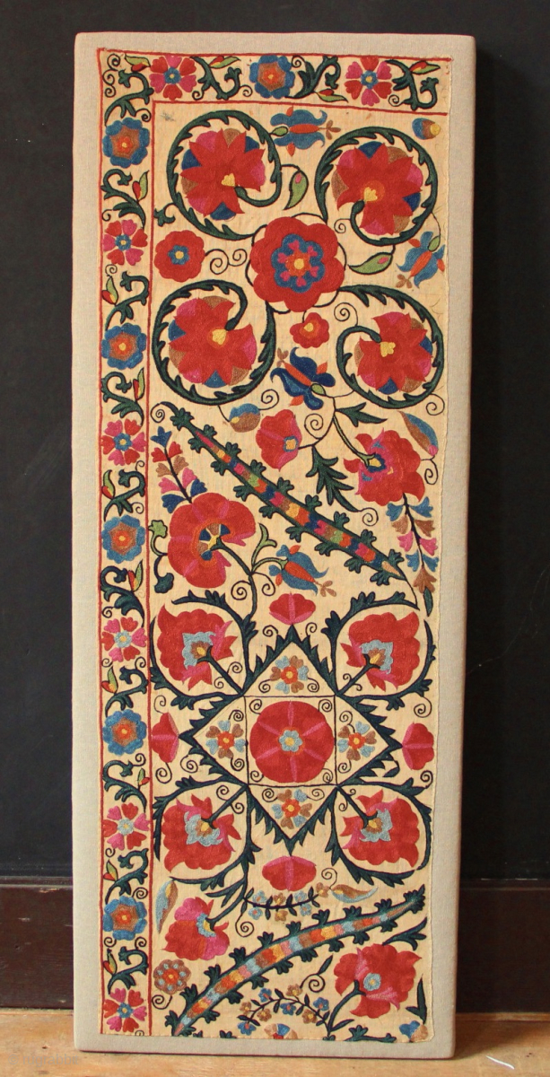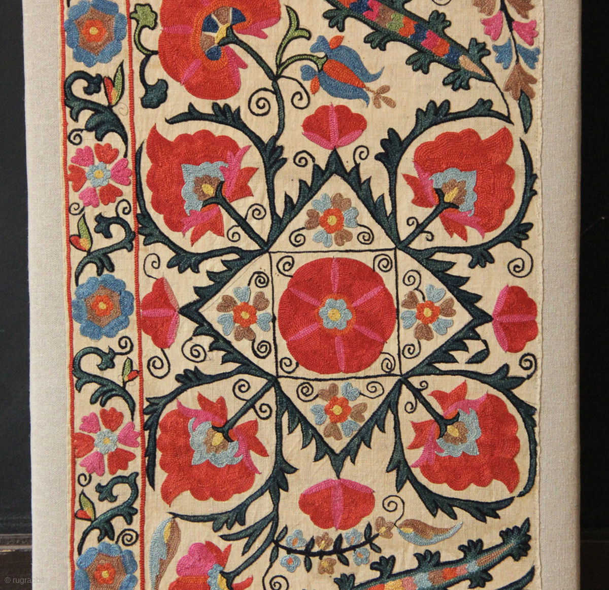 Mid 19th century Nurata Suzani fragment, professionally mounted.