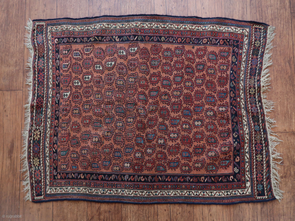 Small sumac boteh flatweave, ca ; 95 cm. x 125 cm. Great borders ( ! ) No holes, no stains, etc. Transcaucasian ? . Old/antique. Wool on wool.( Lightweight. )