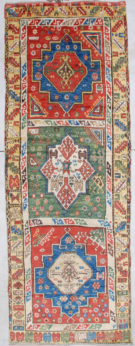 This dated 1870 Konya Oriental Turkish rug #7121 measures 4’8” x 12’10”. It is to my eye one of the most beautiful Konya rugs i have ever seen. The motif consists of three panels. One cherry red, one emerald green and one tomato red, each containing a large medallion. The central ivory medallion is flanked by two sky-blue medallions. The rug is dated in two places and the dates are visible in the green panel and the red panel. These three panels are surrounded by an ivory border with a meandering s design. The main border is that lovely Konya yellow with a mainly leaf and calyx and border which at times is turned and at other times becomes facing triangles. There are more geometric motifs in the lower right corner. The border is extremely well drawn and the manipulation of motif is extremely artistic. Each end is made of wonderful lappets. The top lappets are a variation of meandering s. The bottom lappets, i cannot begin to put a name on. This rug is unbelievably healthy with incredibly full pile. This is a once in a lifetime chance to own a true example of nomad art.