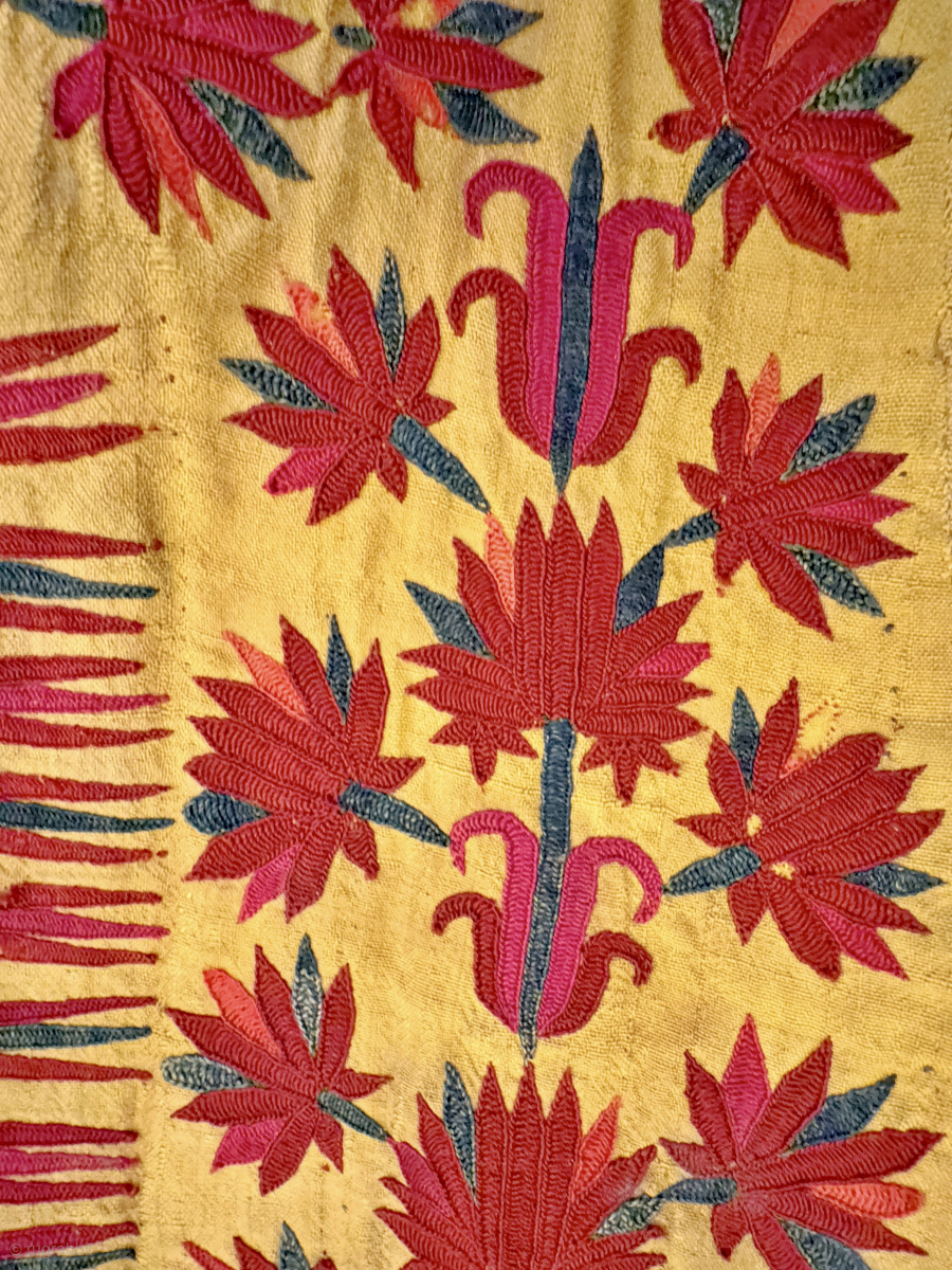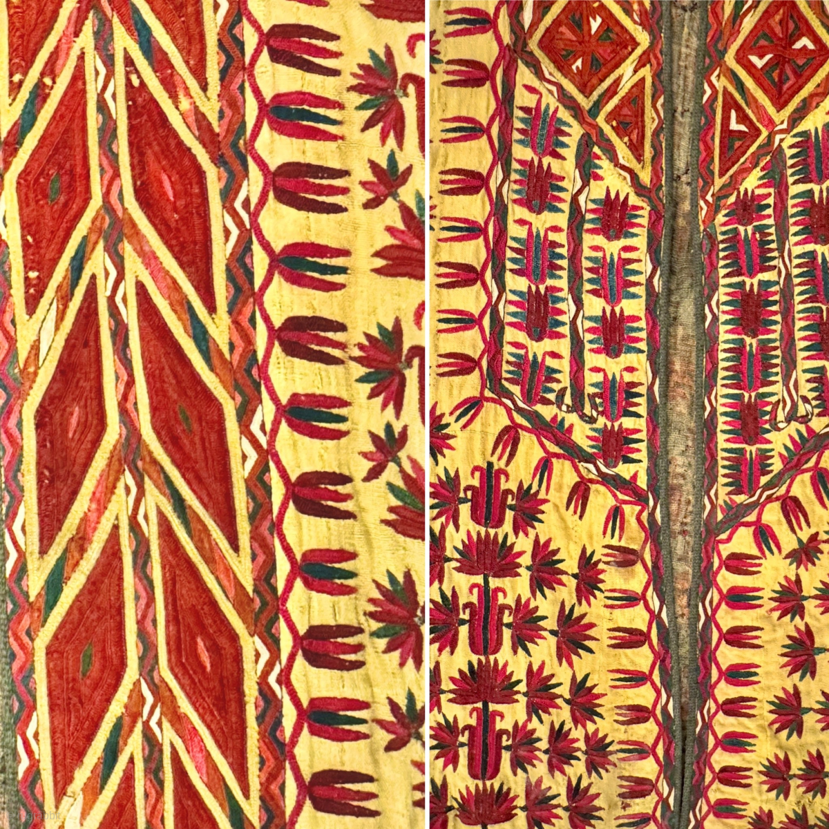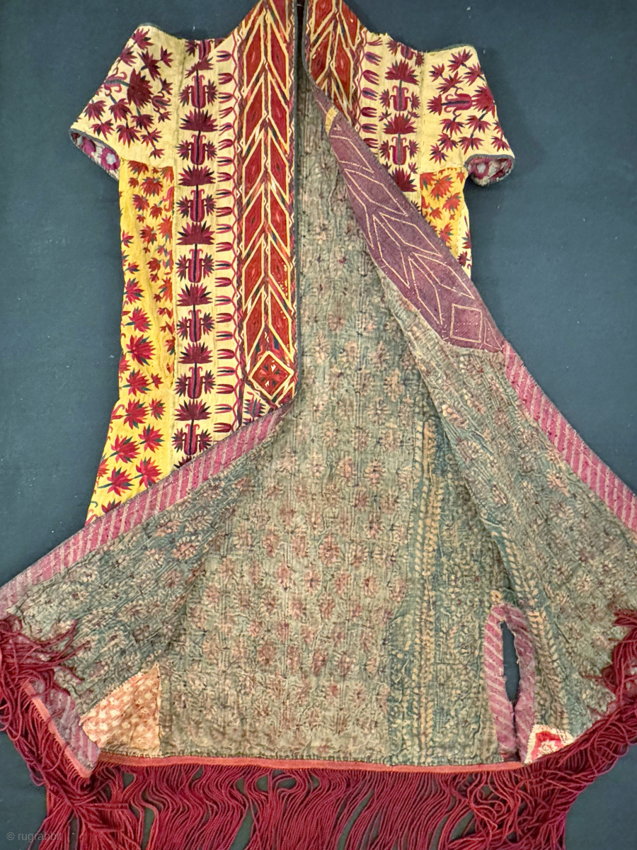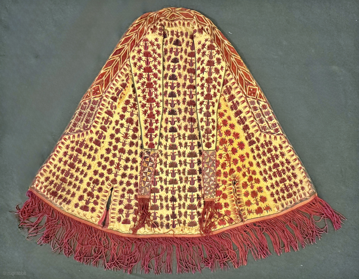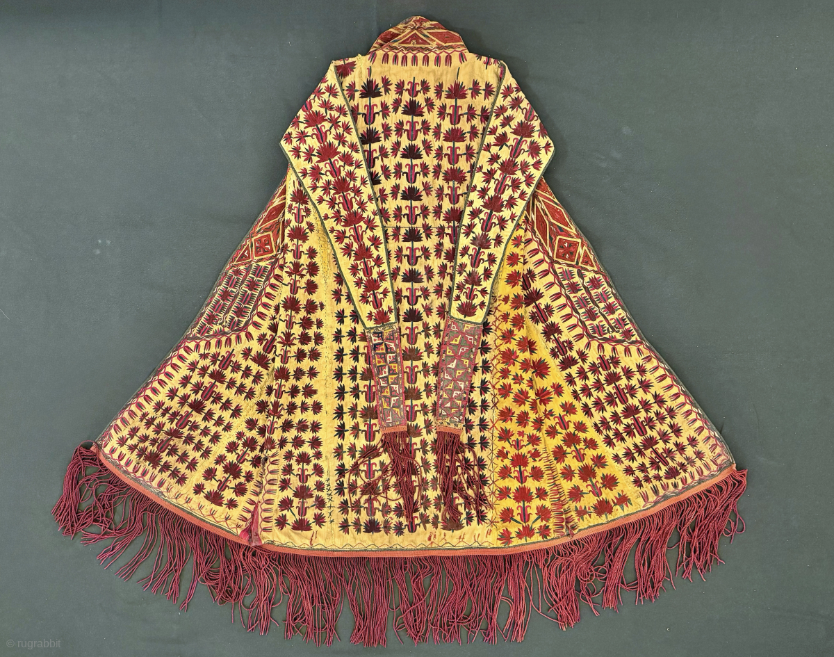 An outstanding and very rare published antique Tekke Turkoman / Turkmen silk embroidered on silk yellow Chyrpy ( Cherpi / Chirpi / Chyrpi ), dating to the second half of 19th Century. The Chyrpy was the quintessential garment of the women in Tekke Turkoman tribes of Central Asia. They were worn as a cloak over the head with the false sleeves hanging down the back. They were made in various ground colour types, each symbolising the status of the woman who would wear it. While all women had and wore the darker indigo and black examples, the yellow ones were reserved only for the married women. Being the most important garment in her life, this garment would be the last thing she would depart with. For this reason the yellow Chyrpy has always been a rare textile art and sought after by collectors around the world. This excellent example has fine polychrome silk embroidery on the yellow silk ground. The gorgeous dyes of the silks really bring out the archaic floral designs. It has the classic block print and plain lining and finished with lovely maroon silk tassels. In good overall shape and lovely patina. It was published in the Helmut Klieber books "Afghanistan. Geschichte. Kultur. Volkskunst. Teppiche. (Landsberg a. Lech 1989)" and "Turkestan. Geschichte. Kultur. Volkskunst. Teppiche. (Landsberg a. Lech 1991)". An excellent textile art worthy of any top collection. size: neck to bottom 110cm (45")… If you message via rugrabbit and don’t get a response within 24 hours, then your message hasn’t got to us so please email directly to: istalificollections@outlook.com.)
