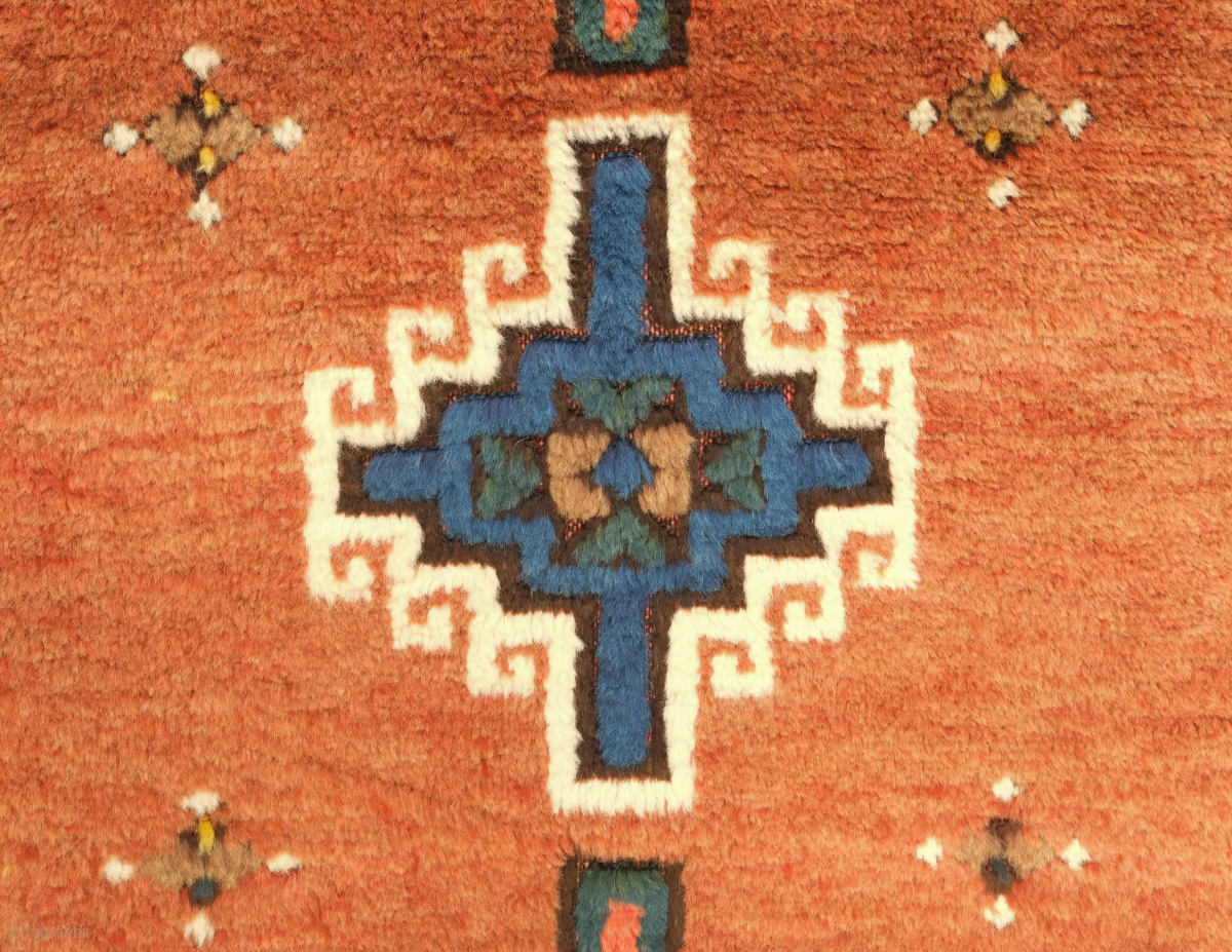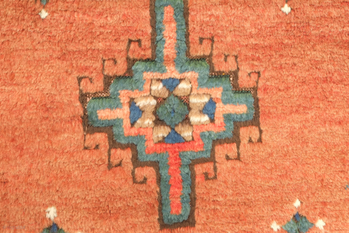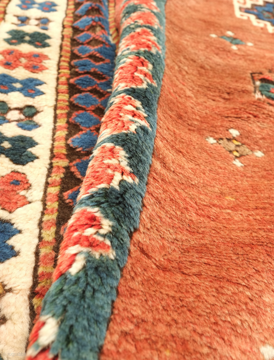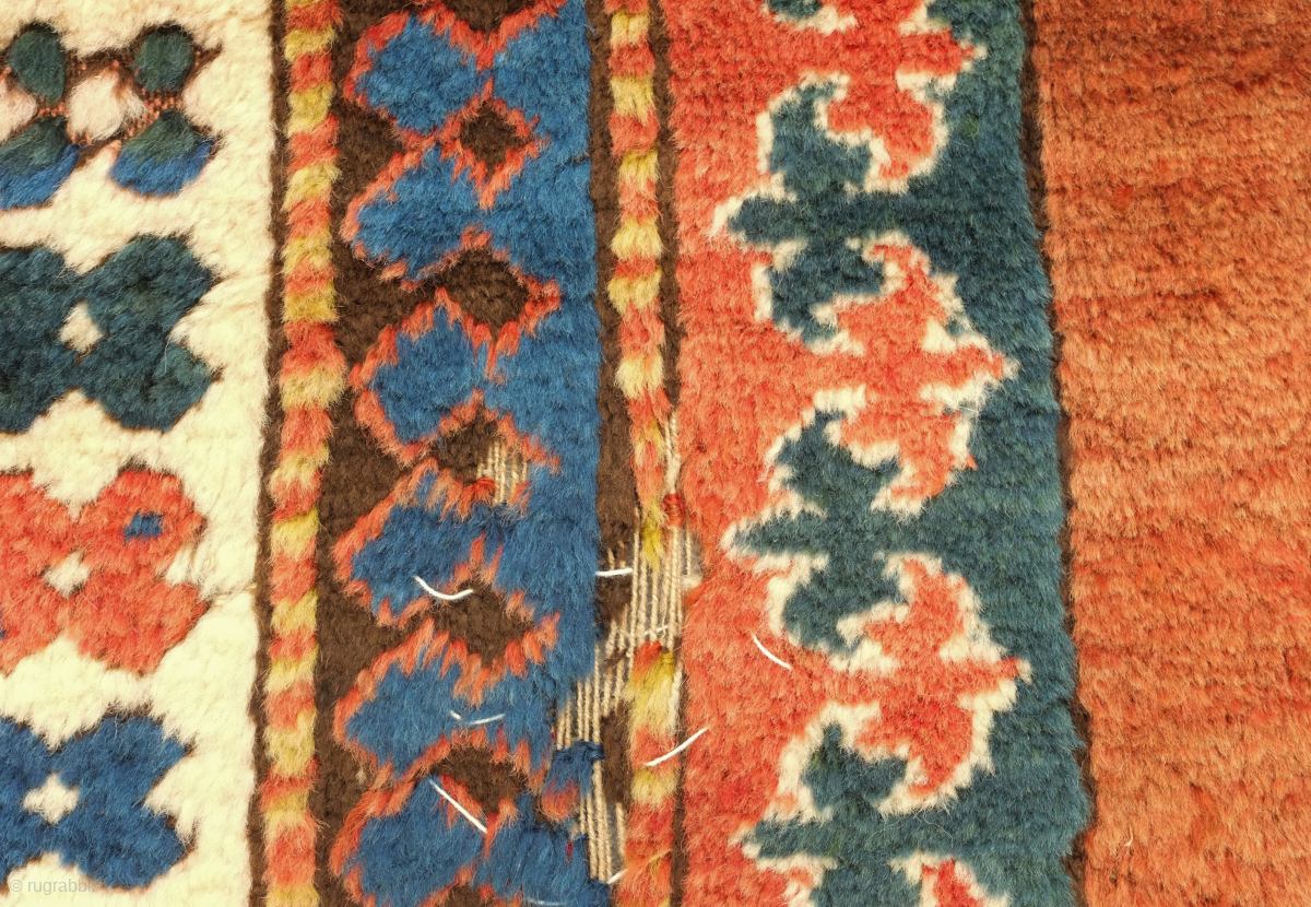 Karabagh rug, around 1850s, In Kazak-like design scheme. It has a meaty pile and a sparsely populated ground. a few spots here and there that need some repair along with the selvedges. Unusual burnt orange, apricot ground color. a couple small holes that can easily be repaired. Full pile. 118 x 204 cm