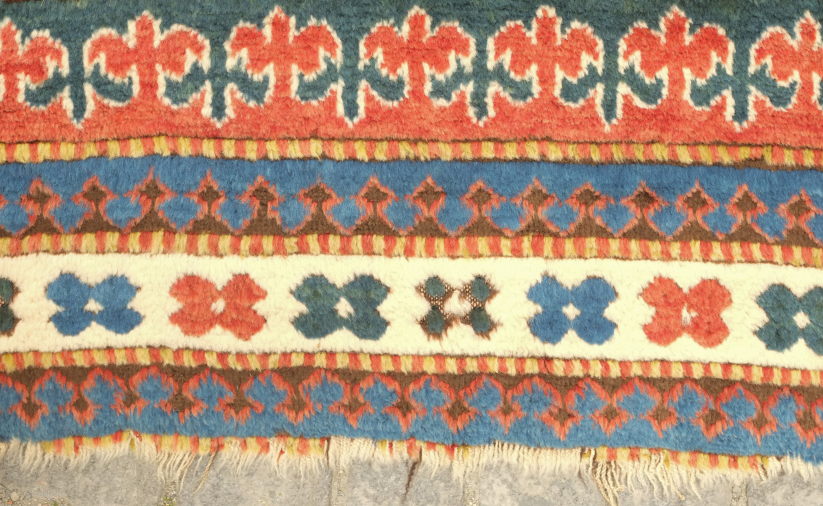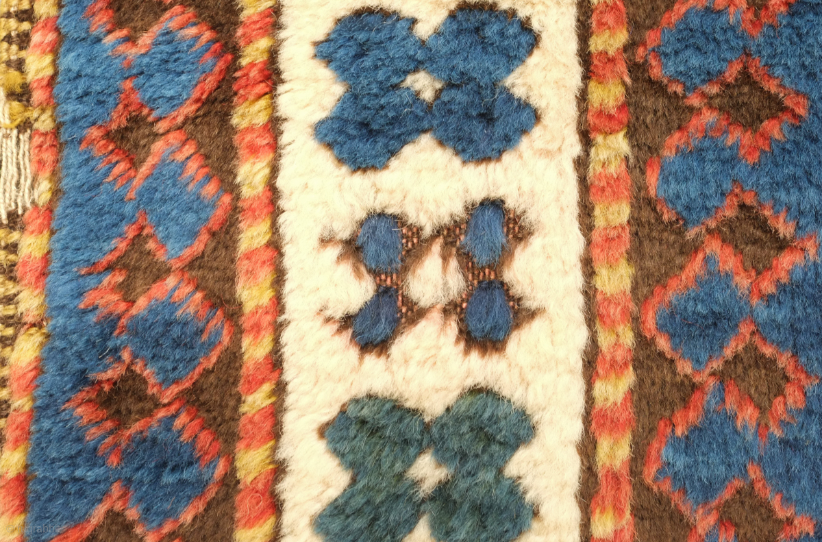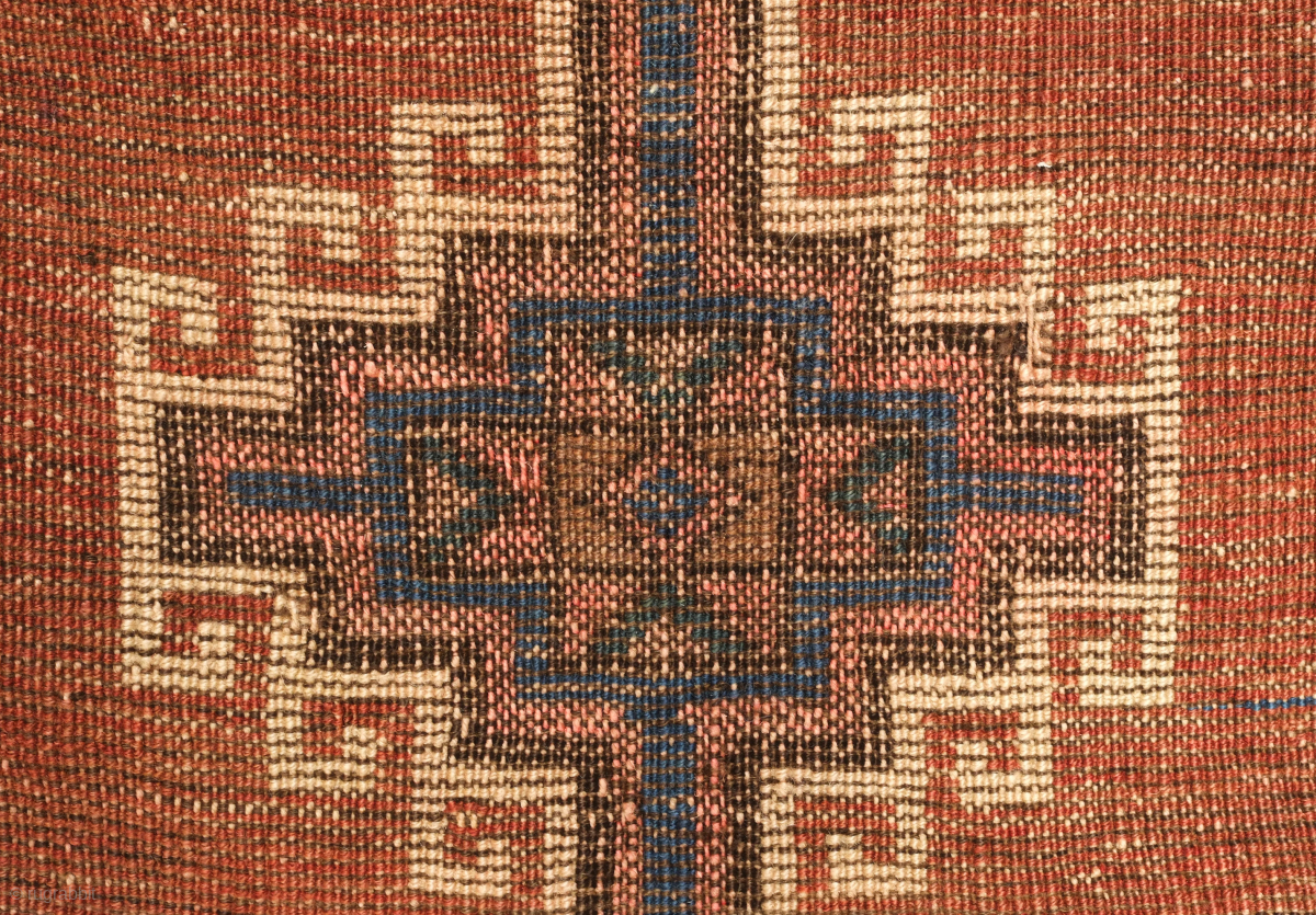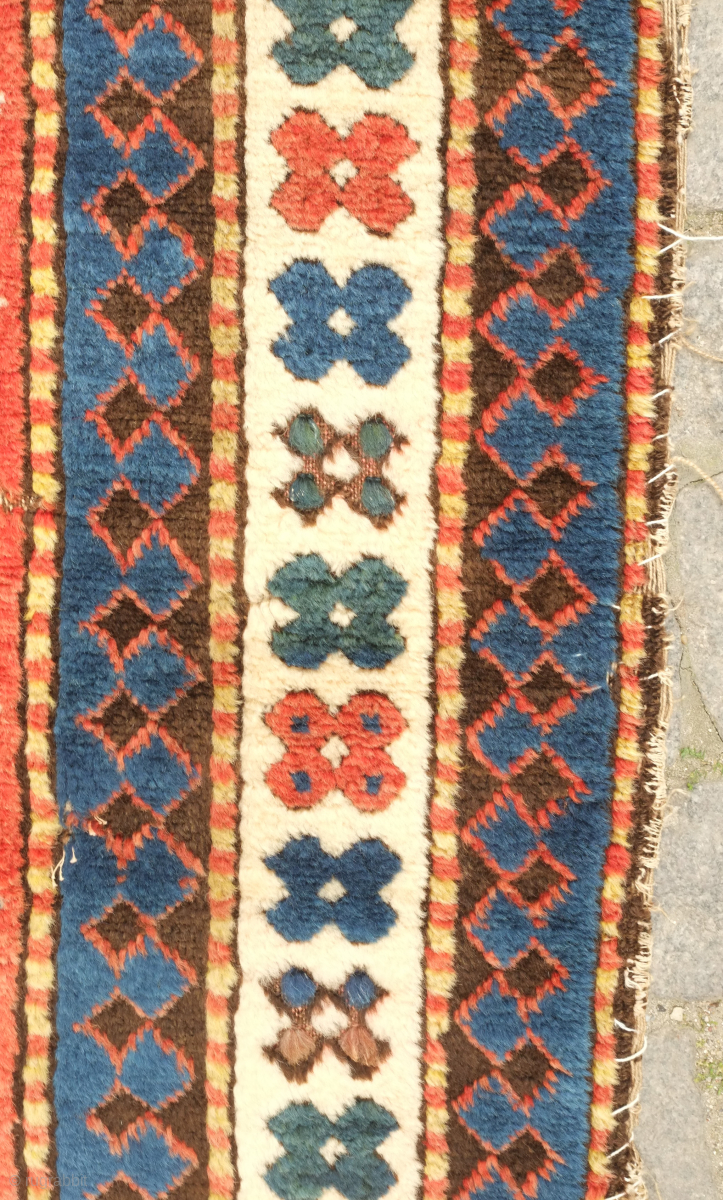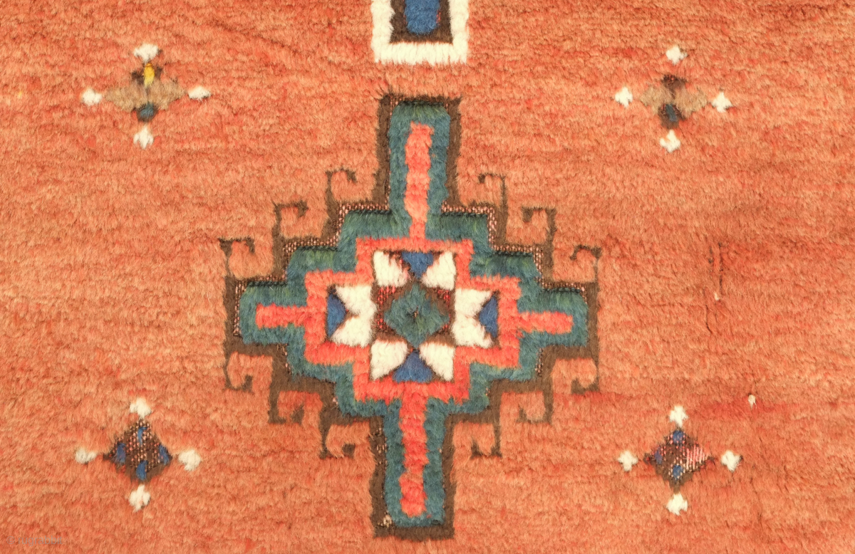 Karabagh rug, around 1850s, In Kazak-like design scheme. It has a meaty pile and a sparsely populated ground. a few spots here and there that need some repair along with the selvedges. Unusual burnt orange, apricot ground color. a couple small holes that can easily be repaired. Full pile. 118 x 204 cm