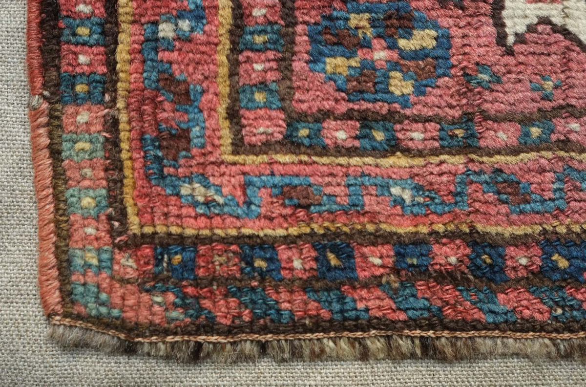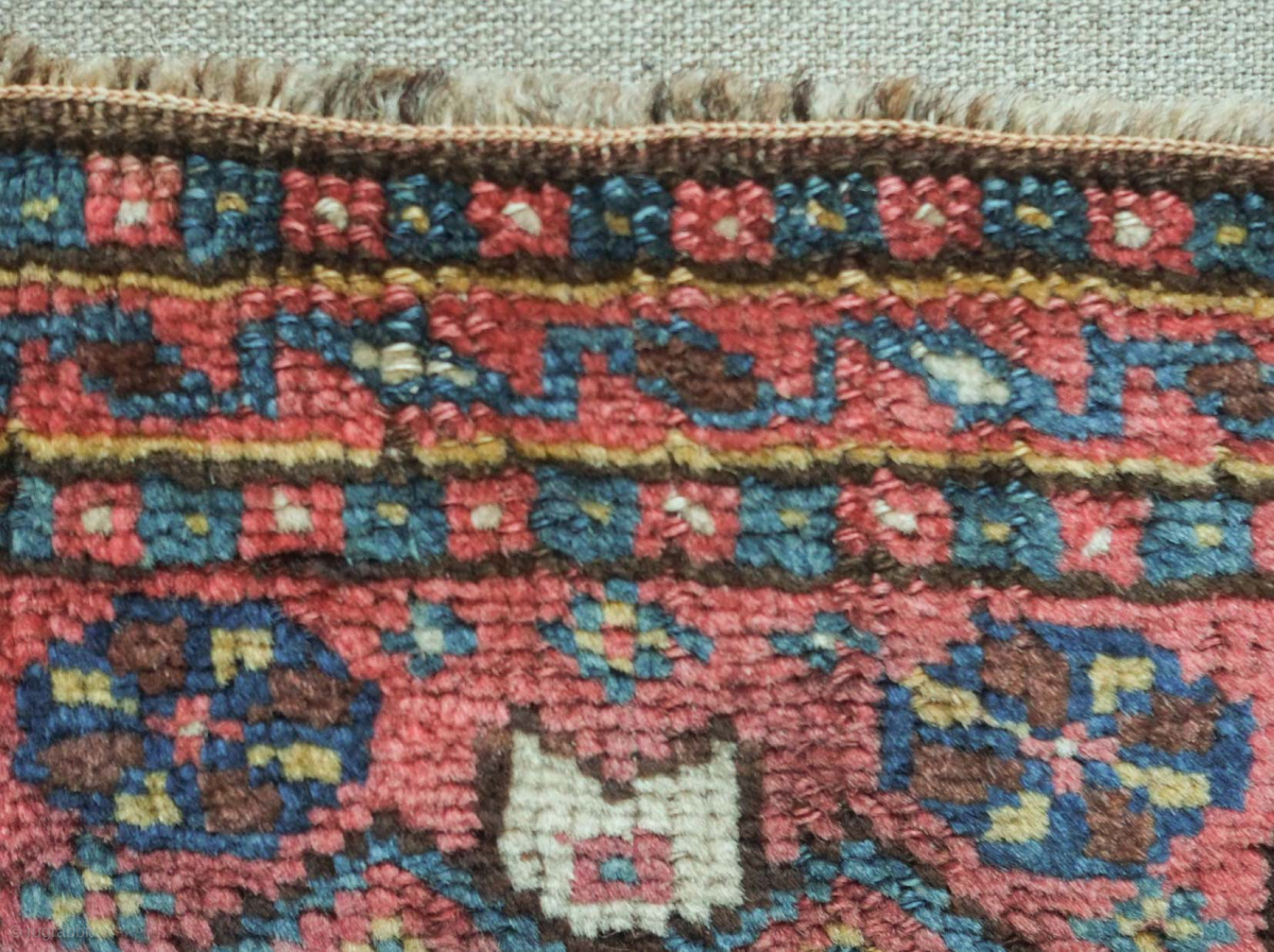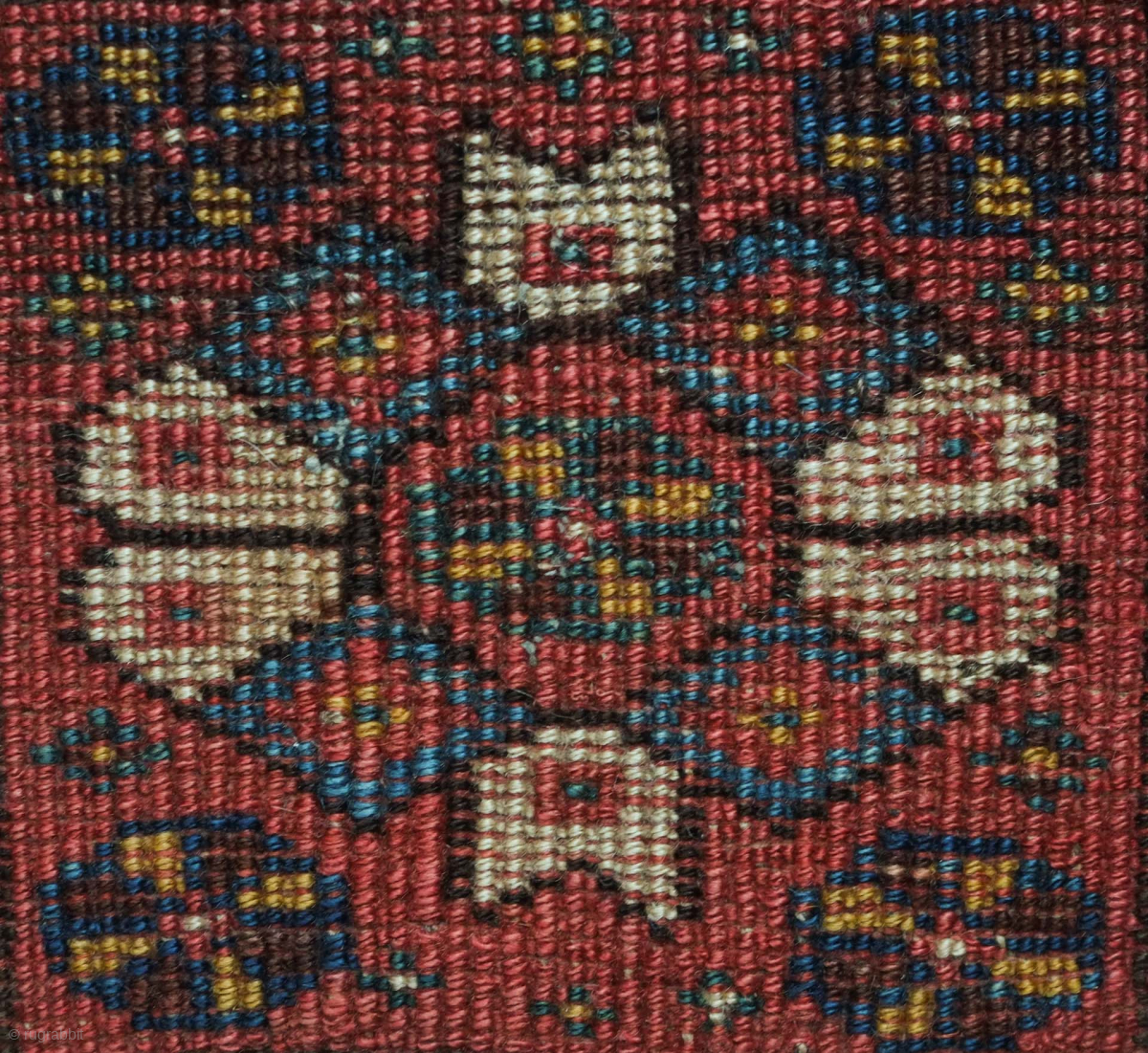 Lori chanteh bag face, 4th quarter of 19th century. a great deal of mellow cochineal appears to be used in this piece giving it a stunning shimmering look. Wool is incredibly silky and lustrous. Knots are symmetrical and pulled to the right a bit and wefts are reddish brown in two shoots. There are very well done repairs on the two bottom edges. 30 x 26 cm. Contact at danauger@tribalgardenrugs.com