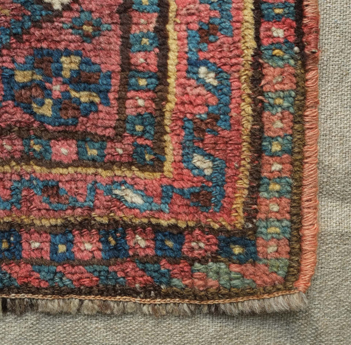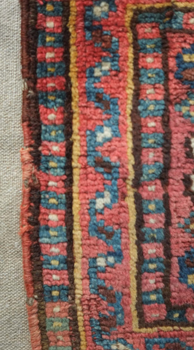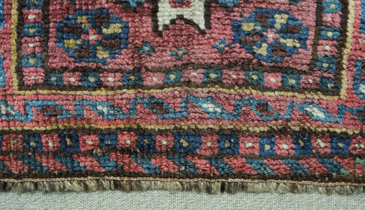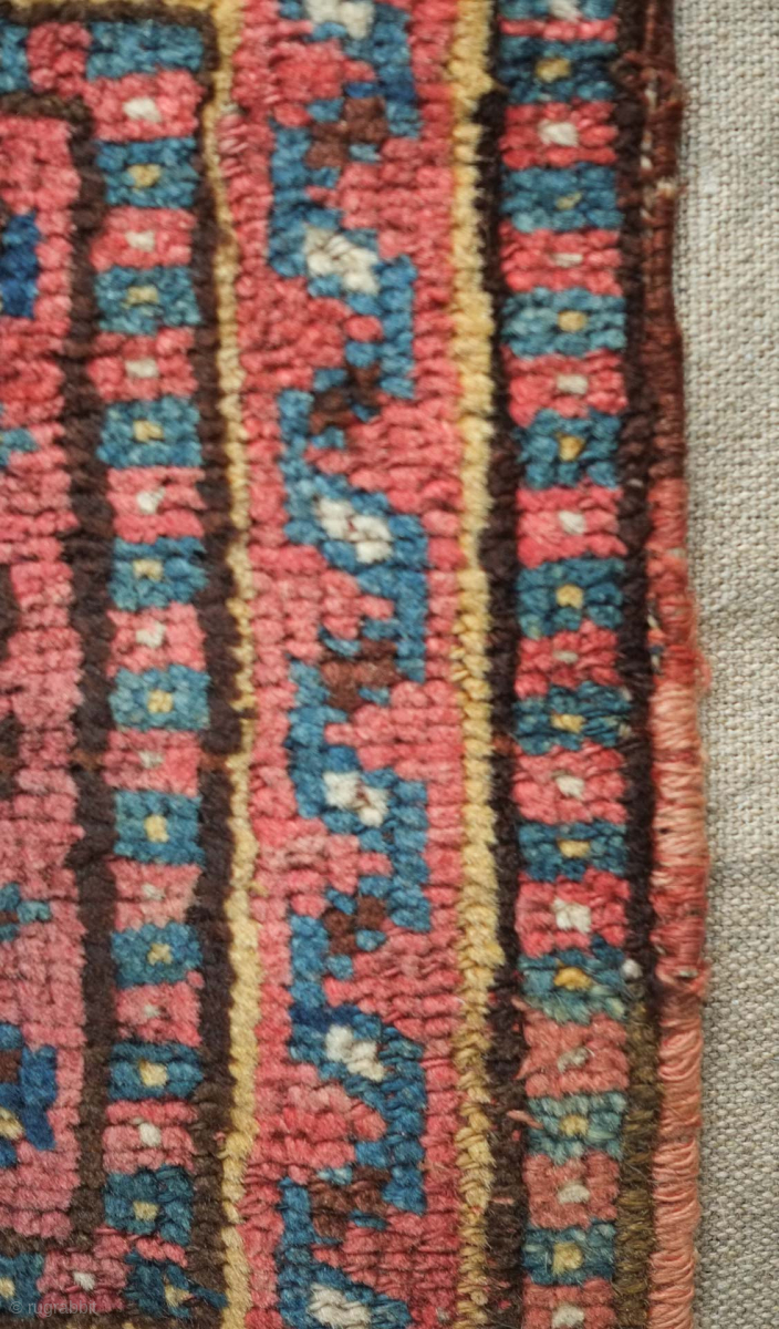 Lori chanteh bag face, 4th quarter of 19th century. a great deal of mellow cochineal appears to be used in this piece giving it a stunning shimmering look. Wool is incredibly silky and lustrous. Knots are symmetrical and pulled to the right a bit and wefts are reddish brown in two shoots. There are very well done repairs on the two bottom edges. 30 x 26 cm. Contact at danauger@tribalgardenrugs.com
