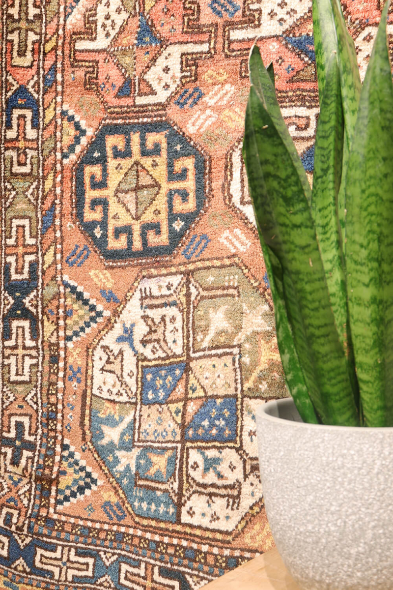 a North West Persian Kurdish rug featuring an oversized design with a large octagon placed in each corner. The central field contains smaller secondary motifs, creating a structured yet lively arrangement.