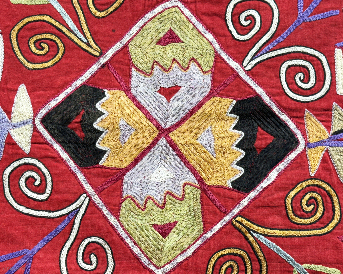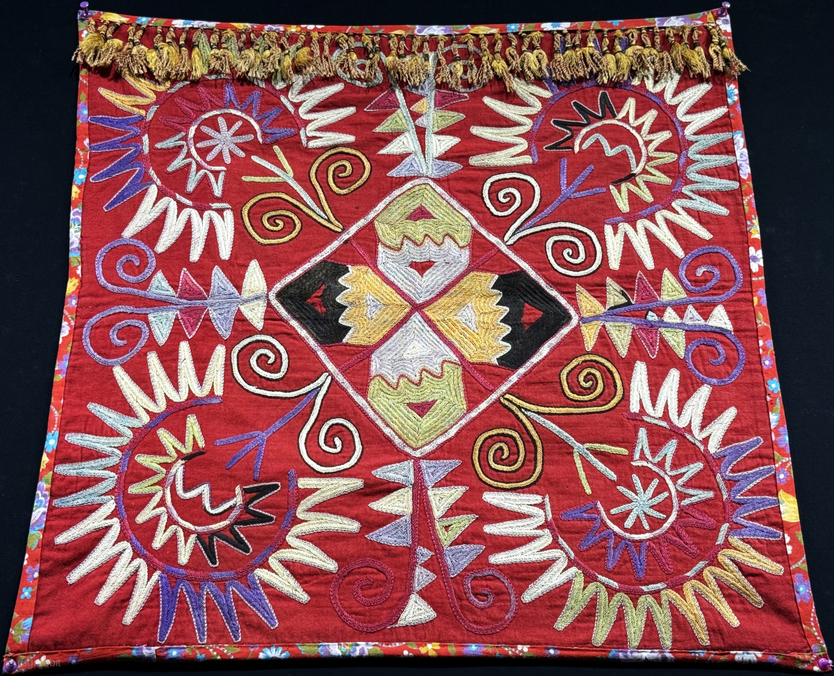 Central Asian Lakai talismanic silk embroidered mirror cover. Saturated natural colors with traditional Lakai Kungrat zoomorphic motifs. Size : 21.5'' x 21'' - ''55 cm x 55 cm'' turkmansilver@gmail.com.